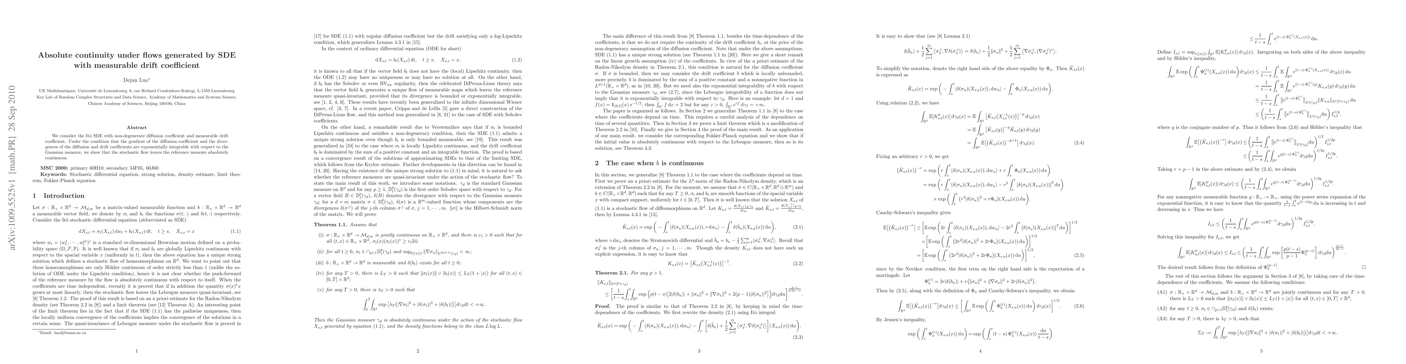 Summary: This paper proves absolute continuity of the stochastic flow generated by an Itô SDE with measurable drift and non-degenerate diffusion, under conditions on the integrability of gradients and divergences of the coefficients with respect to the Gaussian measure. The results establish the flow's absolute continuity relative to the reference measure.