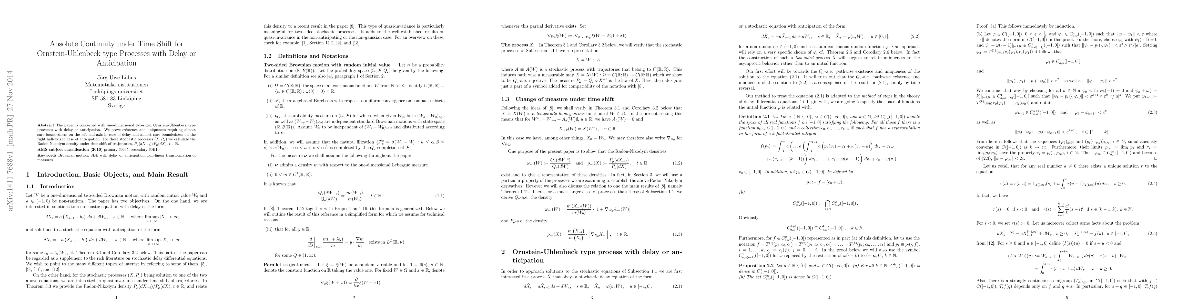 The paper is concerned with one-dimensional two-sided Ornstein-Uhlenbeck type processes with delay or anticipation. We prove existence and uniqueness requiring almost sure boundedness on the left half-axis in case of delay and almost sure boundedness on the right half-axis in case of anticipation. For those stochastic processes $(X,P_{\mu})$ we calculate the Radon-Nikodym density under time shift of trajectories, $P_{\mu}(dX_{\cdot -t})/P_{\mu}(dX)$, $t\in {\Bbb R}$.
