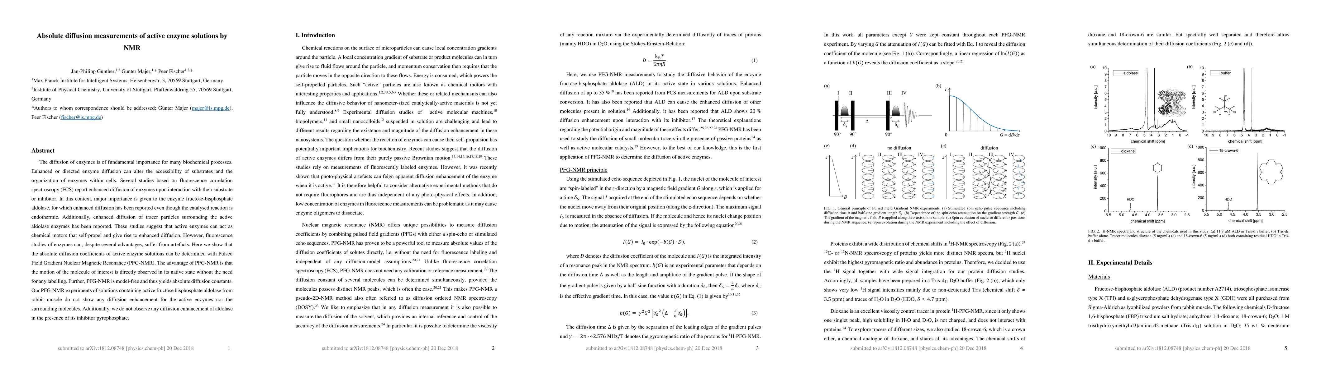 This study uses Pulsed Field Gradient Nuclear Magnetic Resonance (PFG-NMR) to measure the absolute diffusion coefficients of active fructose-bisphosphate aldolase enzymes, finding no evidence of enhanced diffusion despite previous fluorescence studies suggesting otherwise.