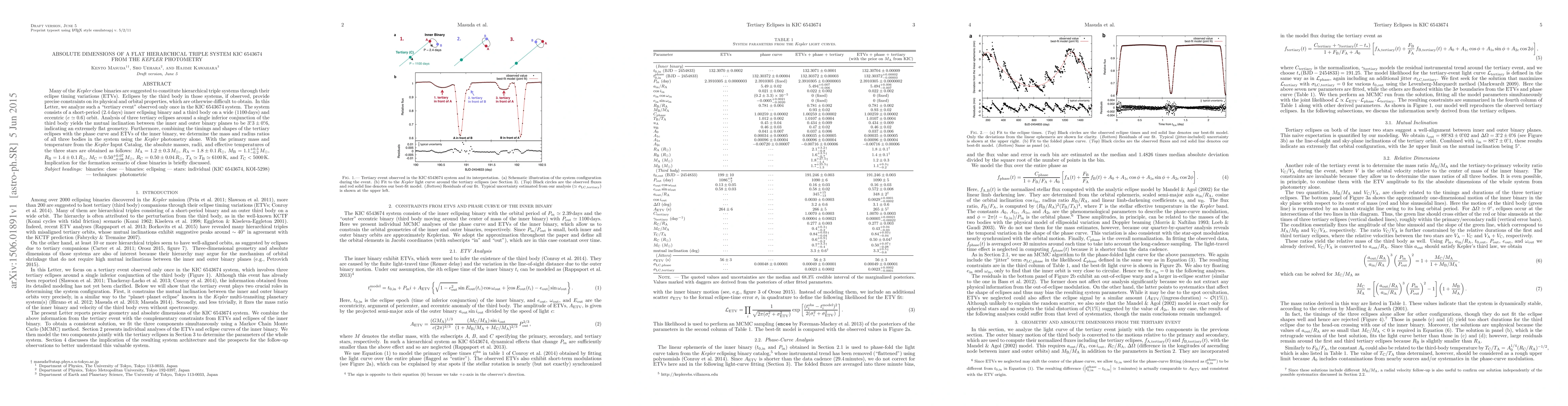Many of the Kepler close binaries are suggested to constitute hierarchical triple systems through their eclipse timing variations (ETVs). Eclipses by the third body in those systems, if observed, provide precise constraints on its physical and orbital properties, which are otherwise difficult to obtain. In this Letter, we analyze such a "tertiary event" observed only once in the KIC 6543674 system. The system consists of a short-period ($2.4\,\mathrm{days}$) inner eclipsing binary and a third body on a wide ($1100\,\mathrm{days}$) and eccentric ($e\simeq0.6$) orbit. Analysis of three tertiary eclipses around a single inferior conjunction of the third body yields the mutual inclination between the inner and outer binary planes to be $3.3^\circ\pm0.6^\circ$, indicating an extremely flat geometry. Furthermore, combining the timings and shapes of the tertiary eclipses with the phase curve and ETVs of the inner binary, we determine the mass and radius ratios of all three bodies in the system using the Kepler photometry alone. With the primary mass and temperature from the Kepler Input Catalog, the absolute masses, radii, and effective temperatures of the three stars are obtained as follows: $M_\mathrm{A}=1.2\pm0.3\,M_\odot$, $R_\mathrm{A}=1.8\pm0.1\,R_\odot$, $M_\mathrm{B}=1.1_{-0.2}^{+0.3}\,M_\odot$, $R_\mathrm{B}=1.4\pm0.1\,R_\odot$, $M_\mathrm{C}=0.50_{-0.08}^{+0.07}\,M_\odot$, $R_\mathrm{C}=0.50\pm0.04\,R_\odot$, $T_\mathrm{A} \simeq T_\mathrm{B}\simeq 6100\,\mathrm{K}$, and $T_\mathrm{C}<5000\,\mathrm{K}$. Implication for the formation scenario of close binaries is briefly discussed.
