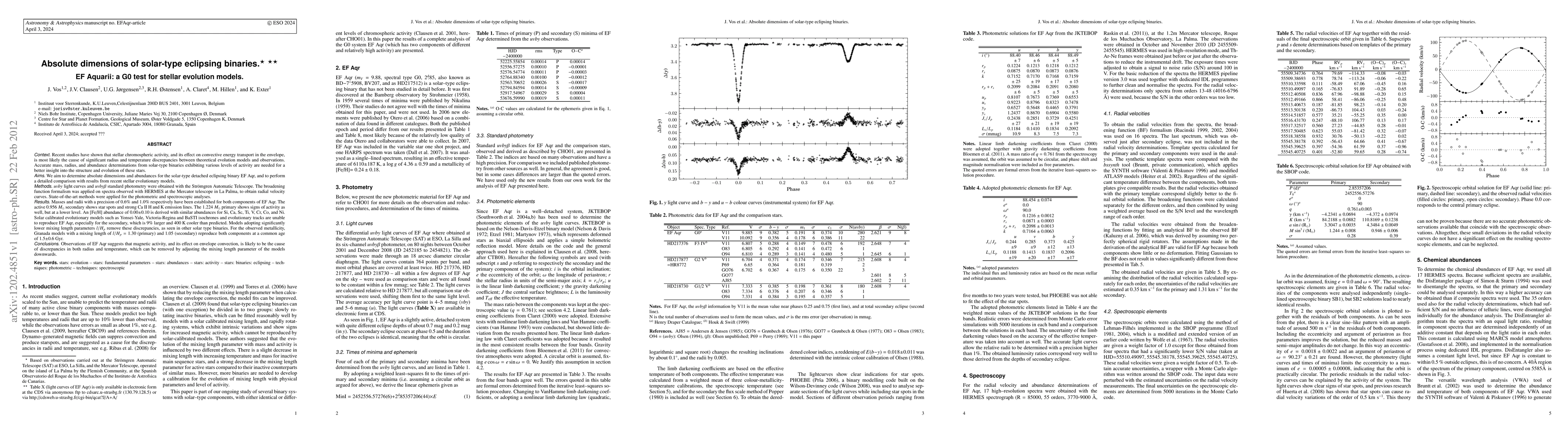 Recent studies have shown that stellar chromospheric activity, and its effect on convective energy transport in the envelope, is most likely the cause of significant radius and temperature discrepancies between theoretical evolution models and observations. We aim to determine absolute dimensions and abundances for the solar-type detached eclipsing binary EF Aqr, and to perform a detailed comparison with results from recent stellar evolutionary models. uvby-beta standard photometry was obtained with the Stromgren Automatic Telescope. The broadening function formalism was applied on spectra observed with HERMES at the Mercator telescope in La Palma, to obtain radial velocity curves. Masses and radii with a precision of 0.6% and 1.0% respectively have been established for both components of EF Aqr. The active 0.956 M_sol secondary shows star spots and strong Ca II H and K emission lines. The 1.224 M_sol primary shows signs of activity as well, but at a lower level. An [Fe/H] abundance of 0.00+-0.10 is derived with similar abundances for Si, Ca, Sc, Ti, V, Cr, Co, and Ni. Solar calibrated evolutionary models such as Yonsei-Yale, Victoria-Regina and BaSTI isochrones and evolutionary tracks are unable to reproduce EF Aqr, especially for the secondary, which is 9% larger and 400 K cooler than predicted. Models adopting significantly lower mixing length parameters l/H_p remove these discrepancies, as seen in other solar type binaries. For the observed metallicity, Granada models with a mixing length of l/H_p=1.30 (primary) and 1.05 (secondary) reproduce both components at a common age of 1.5+-0.6 Gyr. Observations of EF Aqr suggests that magnetic activity, and its effect on envelope convection, is likely to be the cause of discrepancies in both radius and temperature, which can be removed by adjusting the mixing length parameter of the models downwards.