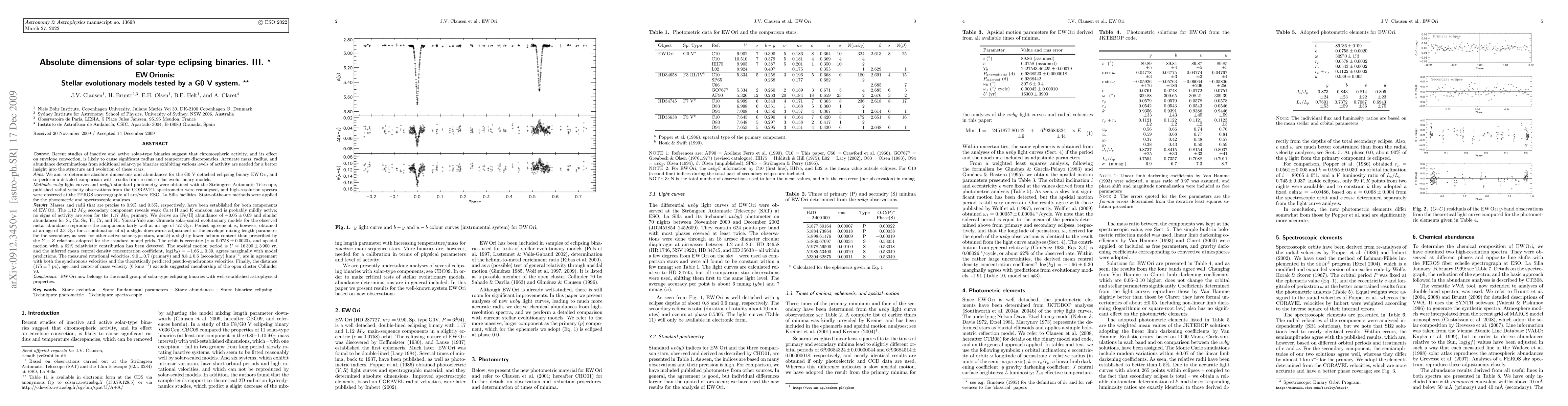 The study of eclipsing binary EW Ori reveals precise masses and radii of its components, with mild activity noted in the secondary star. Stellar models, adjusted for slight mixing length and helium content variations, accurately describe the system at around 2 Gyr age. The binary's orbital eccentricity and apsidal motion are measured, with rotational velocities aligning with synchronous and pseudo-synchronous predictions. The system's distance, age, and velocity rule out membership in Collinder 70, establishing EW Ori as a well-characterized solar-type eclipsing binary.
