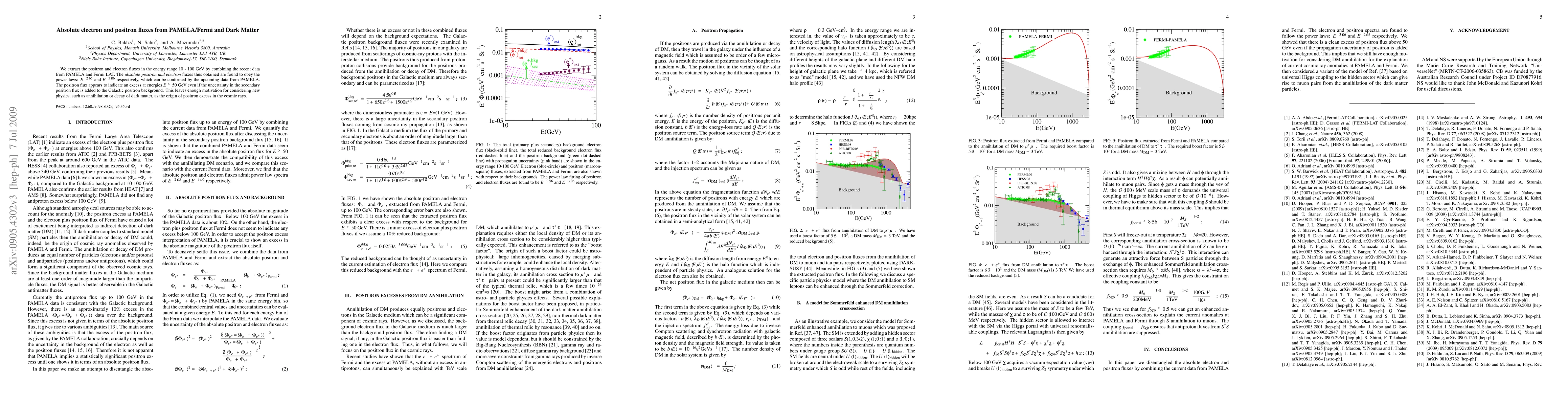 This paper combines PAMELA and Fermi LAT data to determine the absolute fluxes of positrons and electrons in the 10-100 GeV energy range, finding power law behaviors. The positron flux shows an excess at higher energies, suggesting potential dark matter annihilation or decay as a possible explanation.