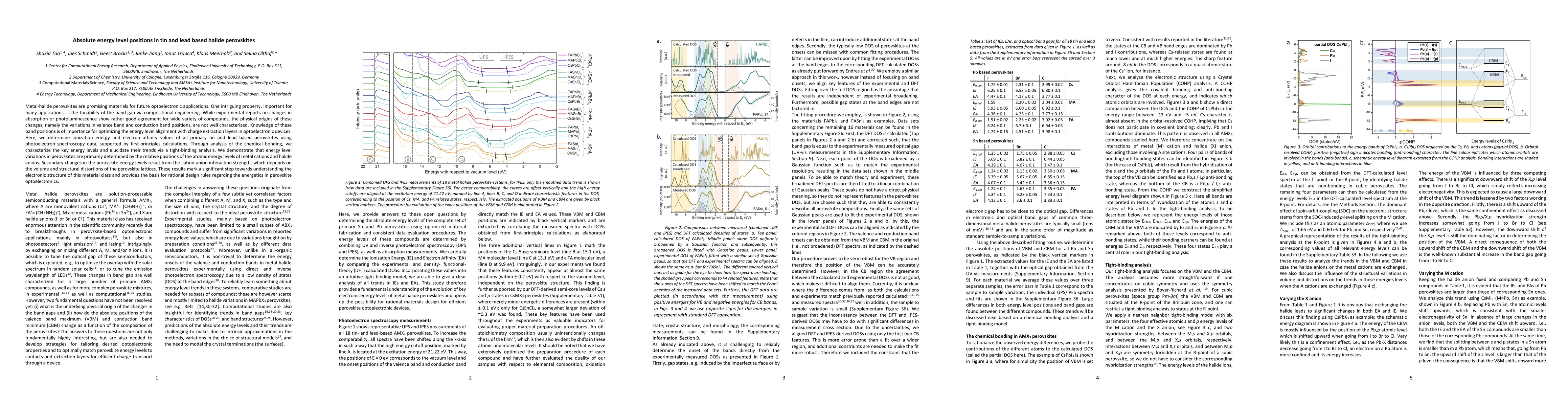 This paper determines ionization energy and electron affinity values for tin and lead halide perovskites using photoelectron spectroscopy and first-principles calculations, revealing that the primary determinant of energy level variations is the relative positions of metal cation and halide anion atomic energy levels, with secondary effects from cation-anion interaction strength.