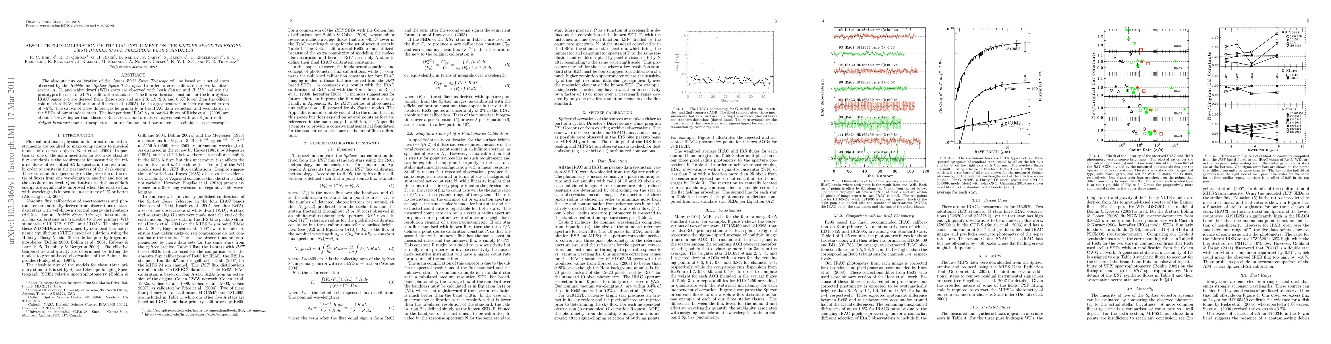 This paper details the absolute flux calibration of the Spitzer Space Telescope's IRAC instrument using Hubble Space Telescope flux standards, revealing calibration constants for IRAC bands 1-4 that are 0.5-2.3% lower than previous values. The differences are primarily due to IRAC data reduction and the spectral energy distributions of the standard stars.