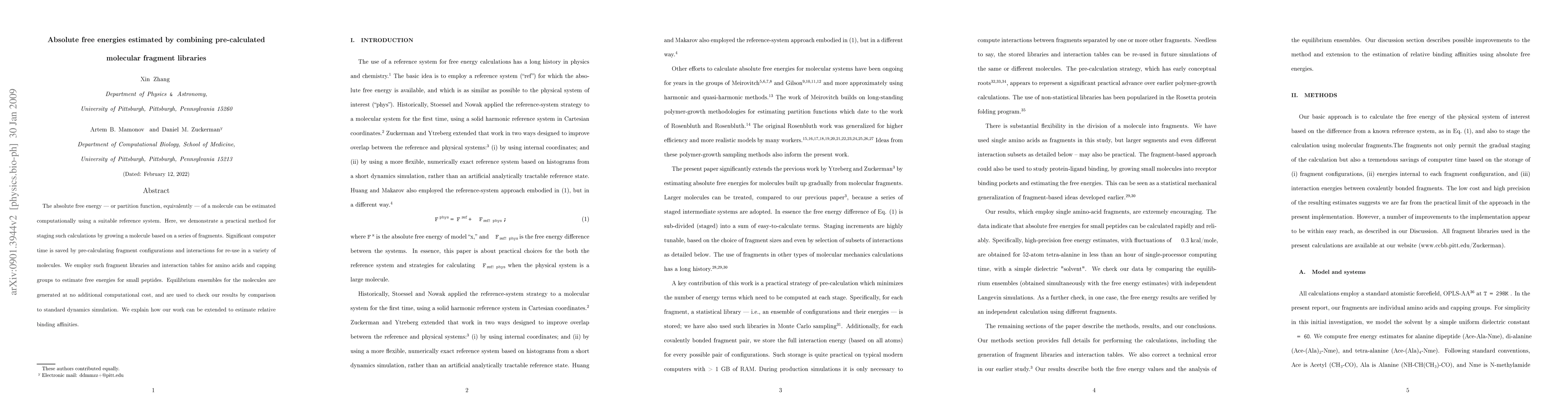This paper presents a computational method for estimating the absolute free energy of molecules by assembling them from pre-calculated fragment libraries, significantly reducing computation time. The approach is demonstrated for small peptides using fragment libraries for amino acids and capping groups, validated by comparison to standard dynamics simulations.