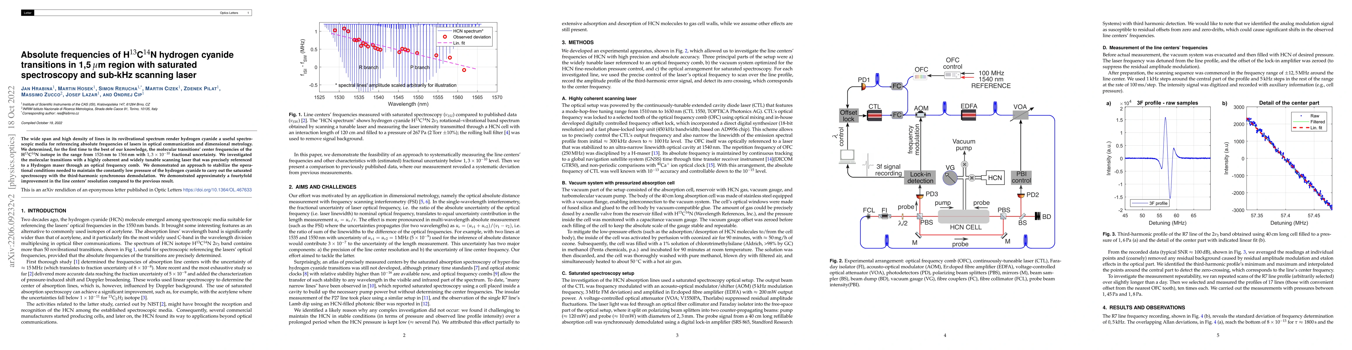 This paper reports the precise determination of absolute frequencies for H13C14N hydrogen cyanide transitions in the 1.5 μm region using saturated spectroscopy and a sub-kHz scanning laser. The study achieved a fractional uncertainty of 1.3e-10, demonstrating a significant improvement in resolution over previous results.