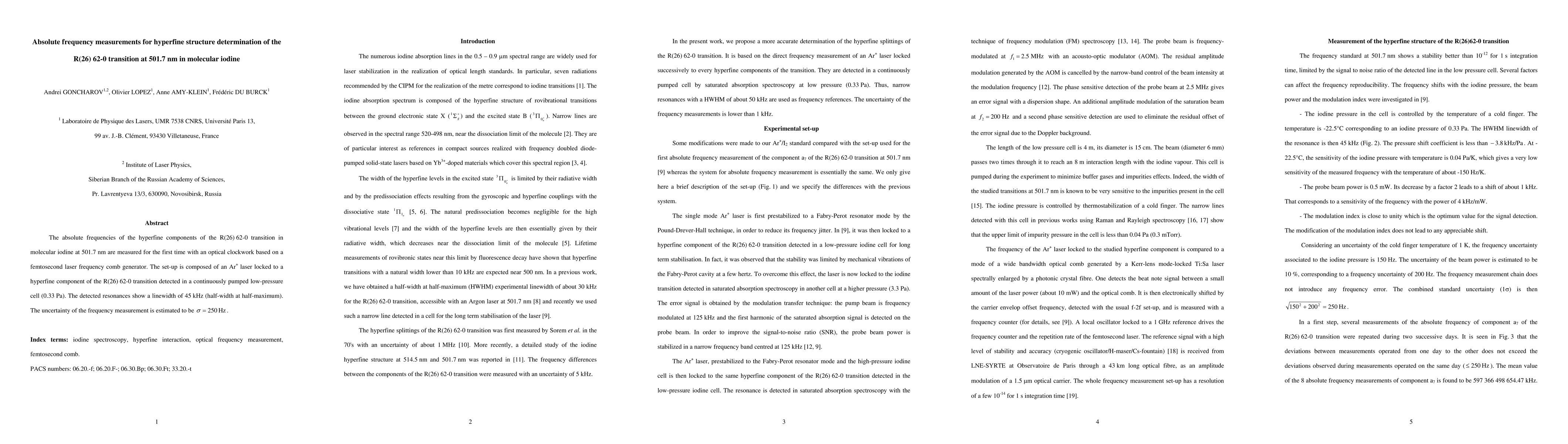 This paper reports the first absolute frequency measurements of the hyperfine components of the R(26) 62-0 transition in molecular iodine at 501.7 nm using an optical clockwork based on a femtosecond laser frequency comb. The setup achieves a measurement uncertainty of 250 Hz with a linewidth of 45 kHz.