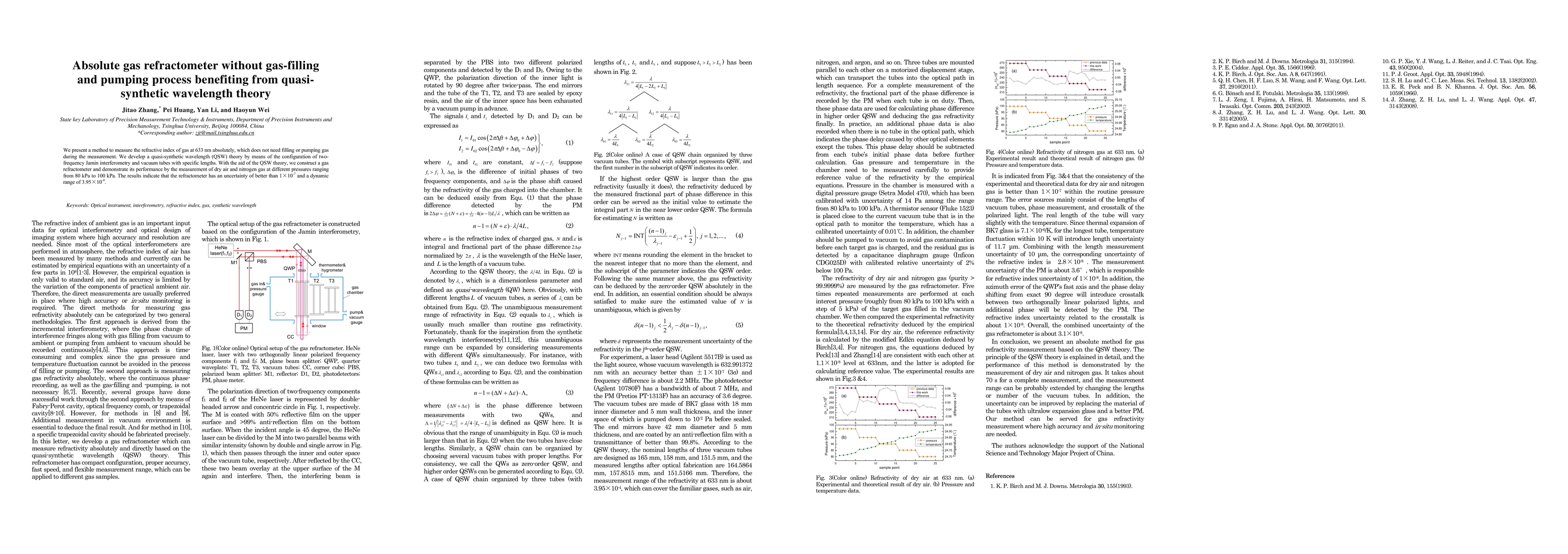 We present a method to measure the refractive index of gas at 633 nm absolutely, which does not need filling or pumping gas during the measurement. We develop a quasi-synthetic wavelength (QSW) theory by means of the configuration of two-frequency Jamin interferometry and vacuum tubes with specific lengths. With the aid of the QSW theory, we construct a gas refractometer and demonstrate its performance by the measurement of dry air and nitrogen gas at different pressures ranging from 80 kPa to 100 kPa. The results indicate that the refractometer has an uncertainty of better than 1E-7 and a dynamic range of 3.95E-4.