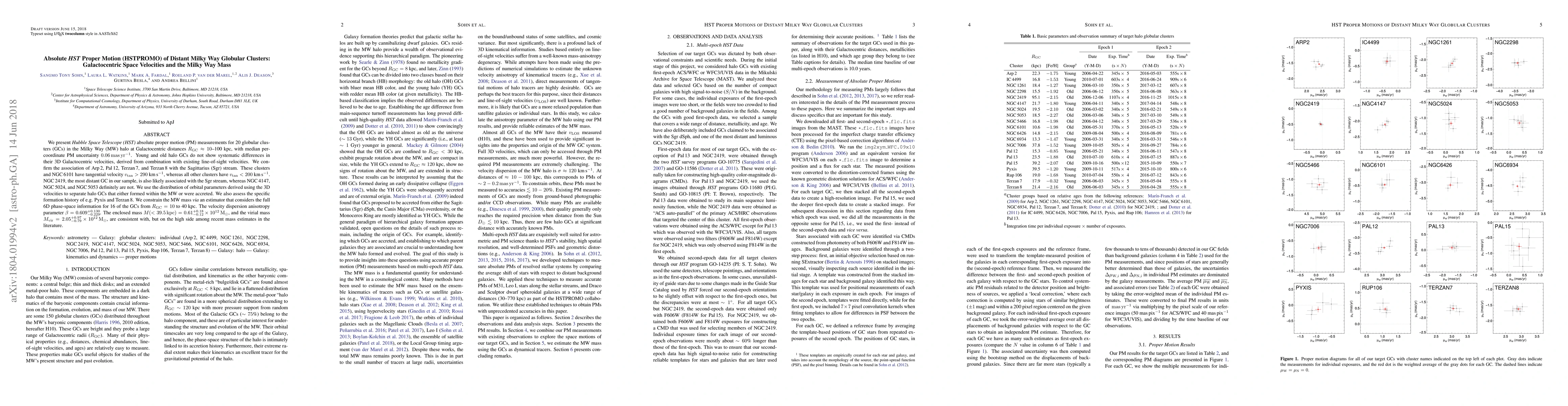 We present Hubble Space Telescope (HST) absolute proper motion (PM) measurements for 20 globular clusters (GCs) in the Milky Way (MW) halo at Galactocentric distances $R_{\rm GC} \approx 10-100$ kpc, with median per-coordinate PM uncertainty 0.06 mas yr$^{-1}$. Young and old halo GCs do not show systematic differences in their 3D Galactocentric velocities, derived from combination with existing line-of-sight velocities. We confirm the association of Arp 2, Pal 12, Terzan 7, and Terzan 8 with the Sagittarius (Sgr) stream. These clusters and NGC 6101 have tangential velocity $V_{\rm tan} > 290$ km s$^{-1}$, whereas all other clusters have $V_{\rm tan} < 200$ km s$^{-1}$. NGC 2419, the most distant GC in our sample, is also likely associated with the Sgr stream, whereas NGC 4147, NGC 5024, and NGC 5053 definitely are not. We use the distribution of orbital parameters derived using the 3D velocities to separate halo GCs that either formed within the MW or were accreted. We also assess the specific formation history of e.g. Pyxis and Terzan 8. We constrain the MW mass via an estimator that considers the full 6D phase-space information for 16 of the GCs from $R_{\rm GC} = 10$ to 40 kpc. The velocity dispersion anisotropy parameter $\beta = 0.609^{+0.130}_{-0.229}$. The enclosed mass $M (<39.5 \rm{kpc}) = 0.61^{+0.18}_{-0.12} \times 10^{12}$ M$_{\odot}$, and the virial mass $M_\rm{vir} = 2.05^{+0.97}_{-0.79} \times 10^{12}$ M$_{\odot}$, are consistent with, but on the high side among recent mass estimates in the literature.