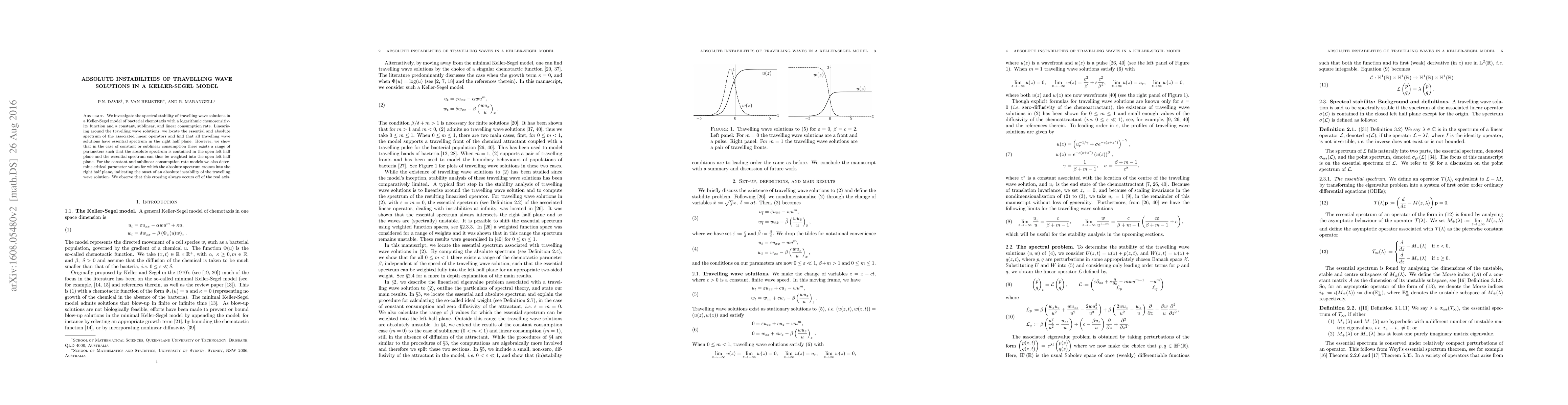 We investigate the spectral stability of travelling wave solutions in a Keller-Segel model of bacterial chemotaxis with a logarithmic chemosensitivity function and a constant, sublinear, and linear consumption rate. Linearising around the travelling wave solutions, we locate the essential and absolute spectrum of the associated linear operators and find that all travelling wave solutions have essential spectrum in the right half plane. However, we show that in the case of constant or sublinear consumption there exists a range of parameters such that the absolute spectrum is contained in the open left half plane and the essential spectrum can thus be weighted into the open left half plane. For the constant and sublinear consumption rate models we also determine critical parameter values for which the absolute spectrum crosses into the right half plane, indicating the onset of an absolute instability of the travelling wave solution. We observe that this crossing always occurs off of the real axis.