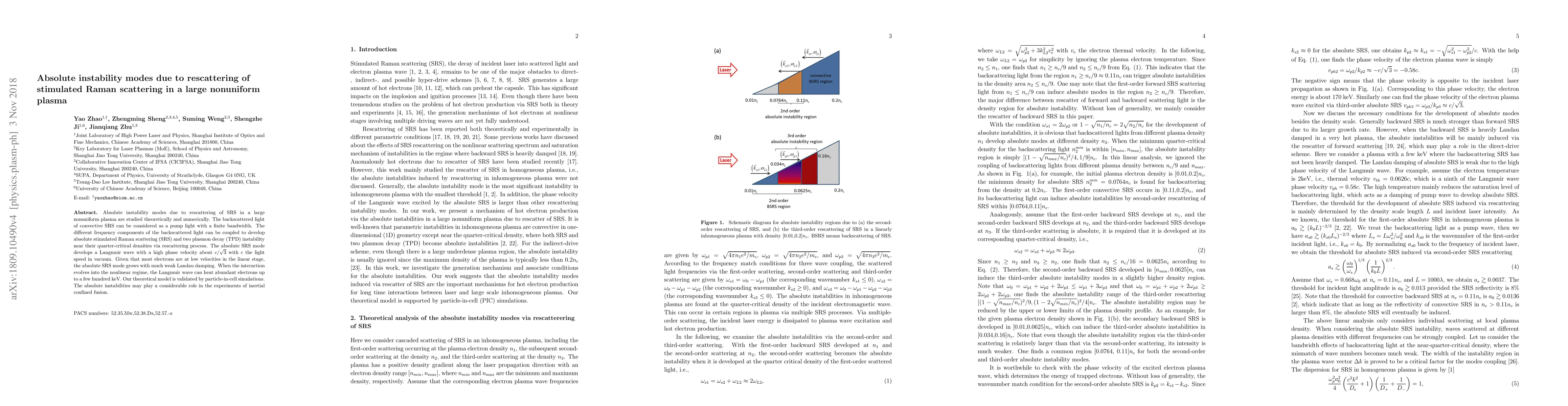 This paper investigates absolute instability modes caused by rescattering in stimulated Raman scattering (SRS) within large nonuniform plasmas, revealing the development of SRS and two plasmon decay (TPD) instabilities. The study combines theoretical analysis and numerical simulations to show that these instabilities can heat electrons up to several hundred keV, potentially impacting inertial fusion experiments.