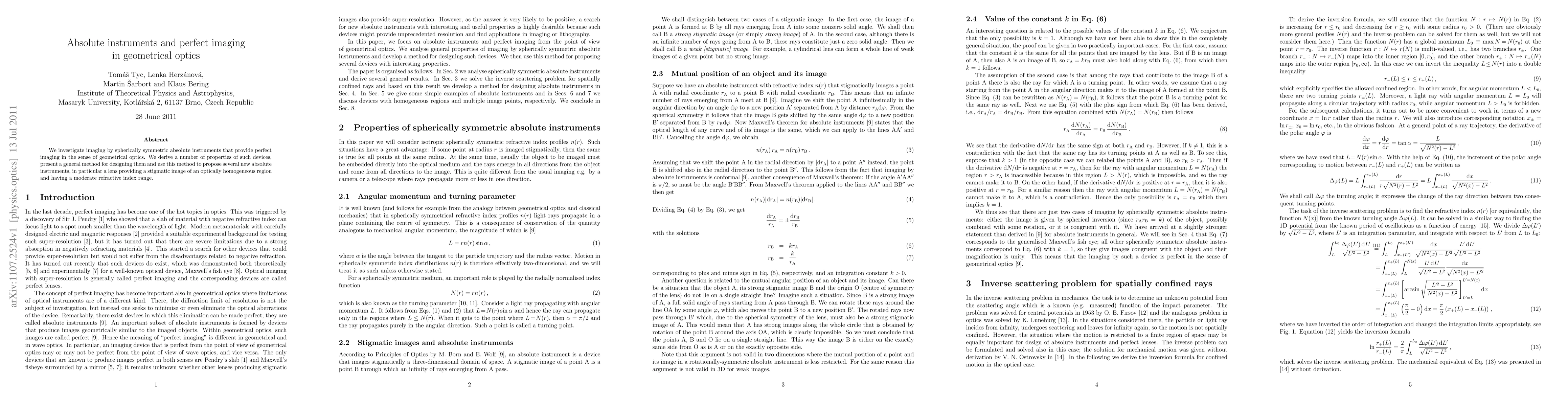 We investigate imaging by spherically symmetric absolute instruments that provide perfect imaging in the sense of geometrical optics. We derive a number of properties of such devices, present a general method for designing them and use this method to propose several new absolute instruments, in particular a lens providing a stigmatic image of an optically homogeneous region and having a moderate refractive index range.