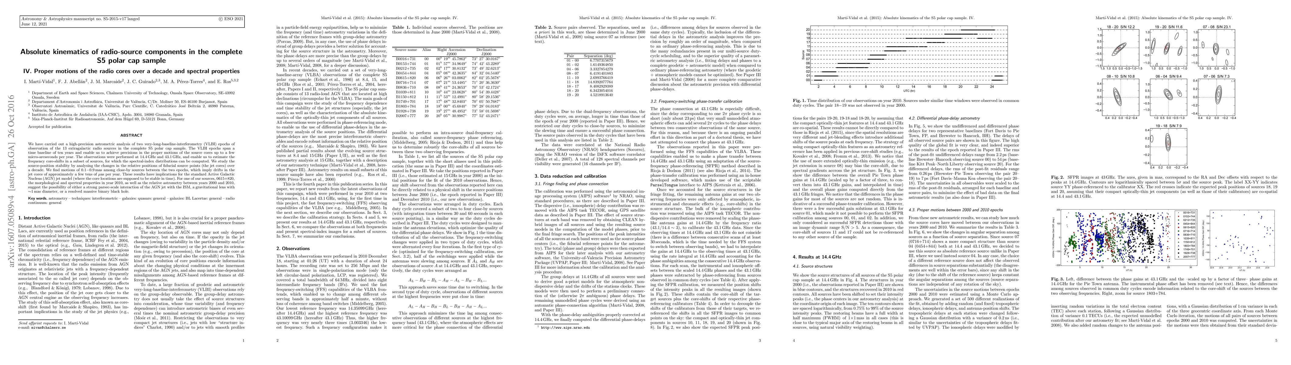 We have carried out a high-precision astrometric analysis of two very-long-baseline-interferometry (VLBI) epochs of observation of the 13 extragalactic radio sources in the complete S5 polar cap sample. The VLBI epochs span a time baseline of 10 years and enable us to achieve precisions in the proper motions of the source cores up to a few micro-arcseconds per year. The observations were performed at 14.4 GHz and 43.1 GHz, and enable us to estimate the frequency core-shifts in a subset of sources, for which the spectral-index distributions can be computed. We study the source-position stability by analysing the changes in the relative positions of fiducial source points (the jet cores) over a decade. We find motions of 0.1-0.9 mas among close-by sources between the two epochs, which imply drifts in the jet cores of approximately a few tens of micro-as per year. These results have implications for the standard Active Galactic Nucleus (AGN) jet model (where the core locations are supposed to be stable in time). For one of our sources, 0615+820, the morphological and spectral properties in year 2010, as well as the relative astrometry between years 2000 and 2010, suggest the possibility of either a strong parsec-scale interaction of the AGN jet with the ISM, a gravitational lens with ~1 mas diameter, or a resolved massive binary black hole.