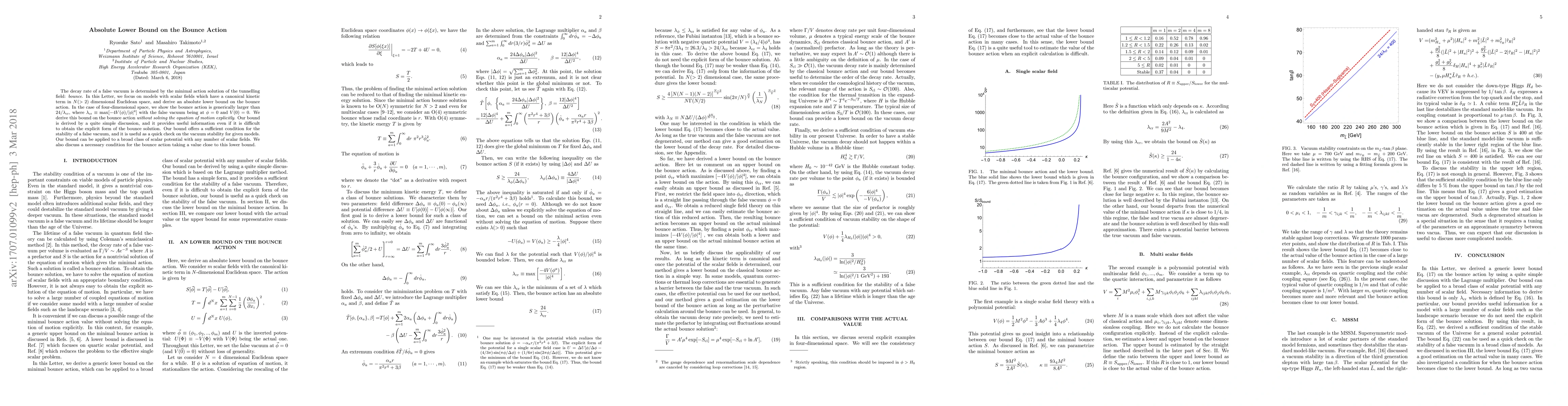 The decay rate of a false vacuum is determined by the minimal action solution of the tunnelling field: bounce. In this Letter, we focus on models with scalar fields which have a canonical kinetic term in $N(>2)$ dimensional Euclidean space, and derive an absolute lower bound on the bounce action. In the case of four-dimensional space, we show the bounce action is generically larger than $24/\lambda_{\rm cr}$, where $\lambda_{\rm cr} \equiv {\rm max} [ -4V(\phi) /|\phi|^4] $ with the false vacuum being at $\phi=0$ and $V(0)=0$. We derive this bound on the bounce action \textit{without solving the equation of motion explicitly}. Our bound is derived by a quite simple discussion, and it provides useful information even if it is difficult to obtain the explicit form of the bounce solution. Our bound offers a sufficient condition for the stability of a false vacuum, and it is useful as a quick check on the vacuum stability for given models. Our bound can be applied to a broad class of scalar potential with any number of scalar fields. We also discuss a necessary condition for the bounce action taking a value close to this lower bound.