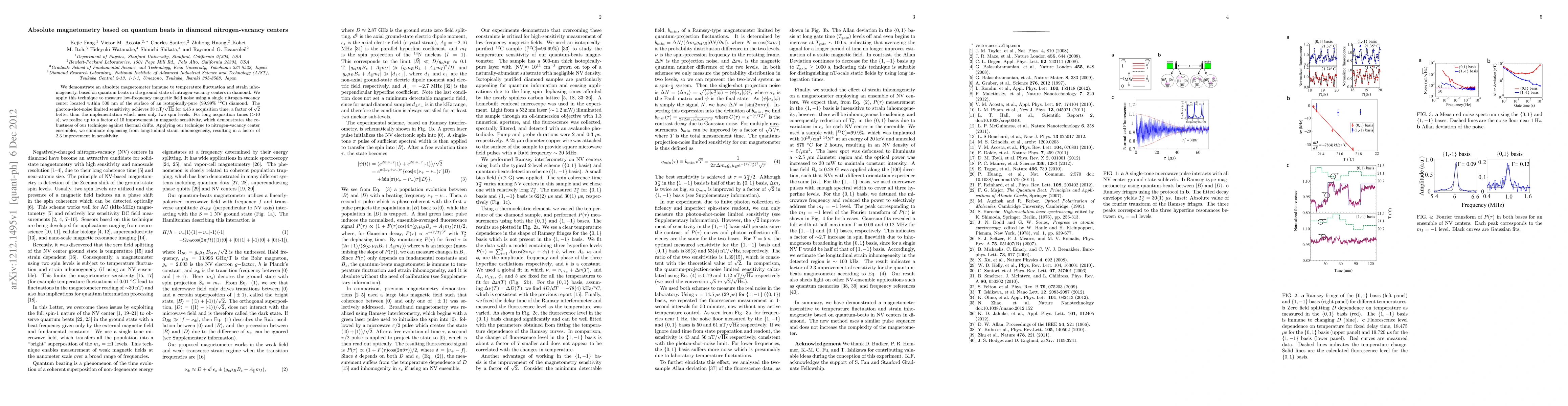 This research develops an absolute magnetometer using quantum beats in nitrogen-vacancy centers in diamond, achieving superior sensitivity to magnetic field noise over long acquisition times, and eliminating strain-induced dephasing. The method demonstrates photon-shot-noise limited sensitivity of 38 nT/Hz^1/2.