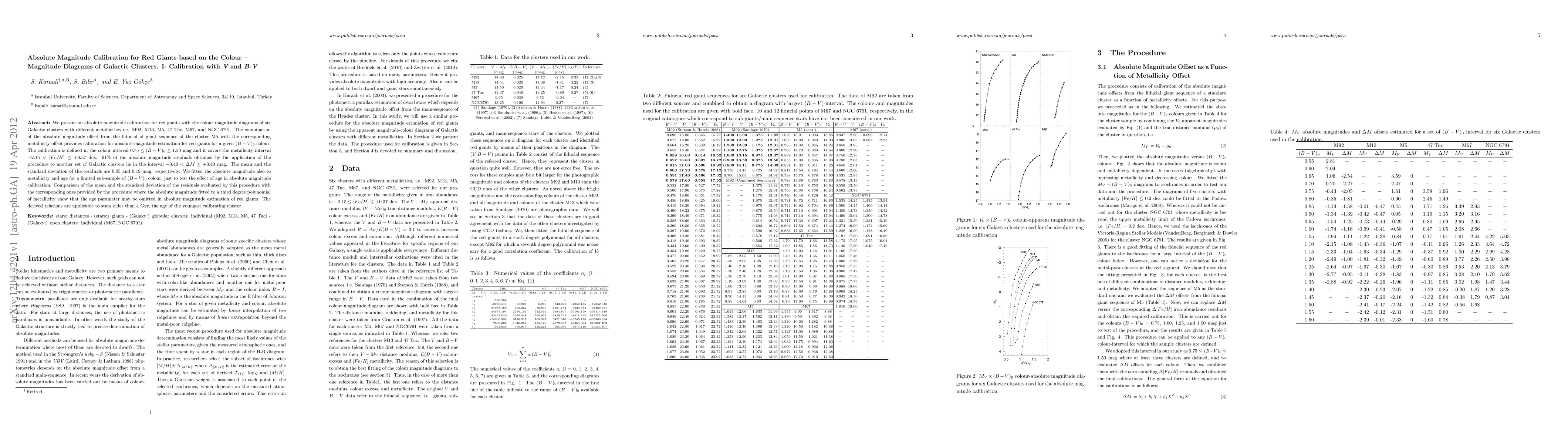 This paper presents a calibration method for the absolute magnitude of red giants using colour-magnitude diagrams from six Galactic clusters. The method combines the absolute magnitude offset from M5 cluster's fiducial giant sequence with metallicity offset, providing a reliable estimation for red giants within the (B-V)o colour range of 0.75 to 1.50 mag. The calibration shows minimal residuals, indicating its effectiveness for stars older than 4 Gyr.