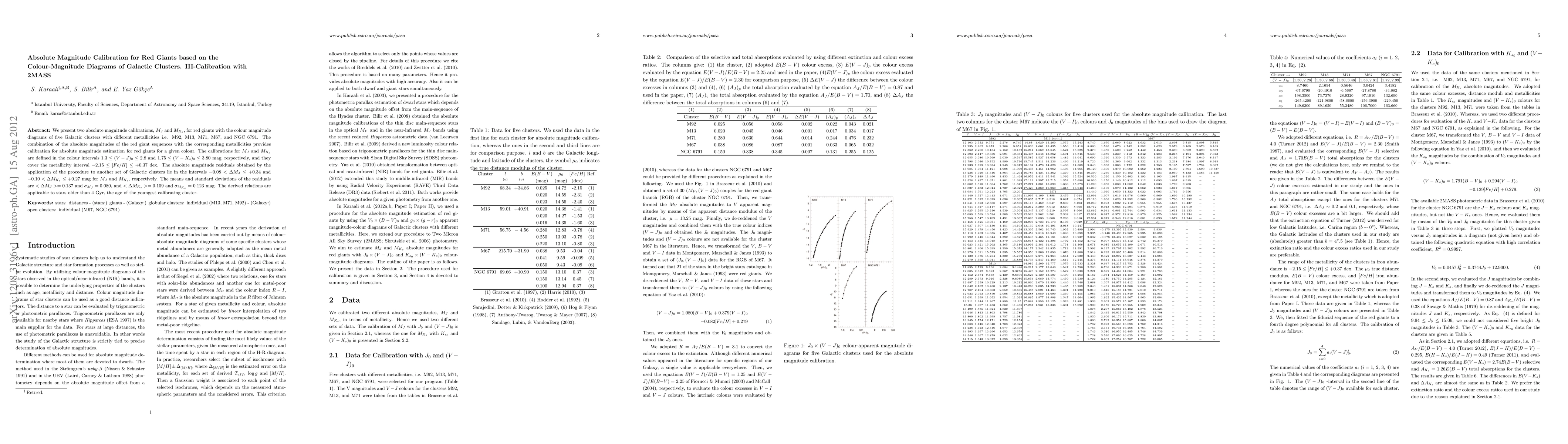 This paper calibrates absolute magnitudes $M_{J}$ and $M_{K_s}$ for red giants using colour-magnitude diagrams from five Galactic clusters, providing a method for estimating magnitudes based on colour and metallicity. The calibrations show residuals of less than 0.34 mag for $M_{J}$ and 0.27 mag for $M_{K_s}$.