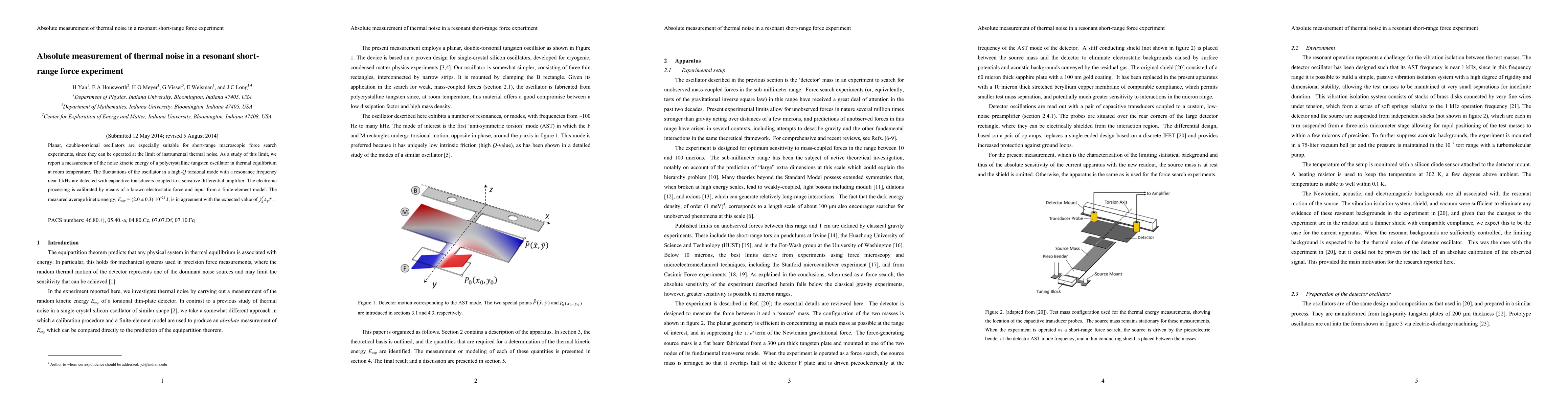 Planar, double-torsional oscillators are especially suitable for short-range macroscopic force search experiments, since they can be operated at the limit of instrumental thermal noise. As a study of this limit, we report a measurement of the noise kinetic energy of a polycrystalline tungsten oscillator in thermal equilibrium at room temperature. The fluctuations of the oscillator in a high-Q torsional mode with a resonance frequency near 1 kHz are detected with capacitive transducers coupled to a sensitive differential amplifier. The electronic processing is calibrated by means of a known electrostatic force and input from a finite element model. The measured average kinetic energy is in agreement with the expected value of 1/2 kT.