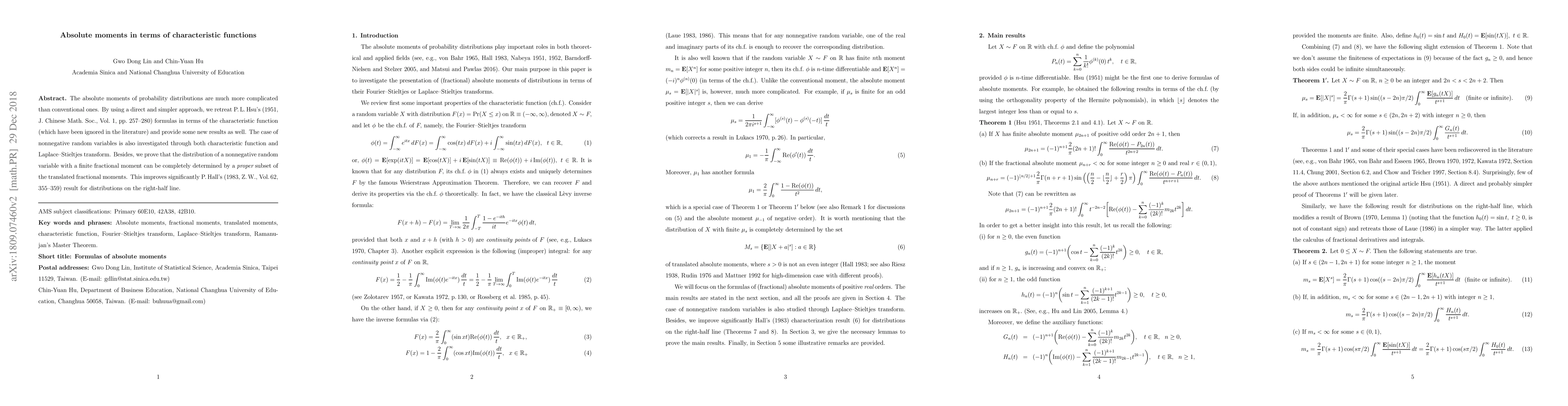 The absolute moments of probability distributions are much more complicated than conventional ones. By using a direct and simpler approach, we retreat P. L. Hsu's (1951, J. Chinese Math. Soc., Vol. 1, pp. 257-280) formulas in terms of the characteristic function (which have been ignored in the literature) and provide some new results as well. The case of nonnegative random variables is also investigated through both characteristic function and Laplace-Stieltjes transform. Besides, we prove that the distribution of a nonnegative random variable with a finite fractional moment can be completely determined by a proper subset of the translated fractional moments. This improves significantly P. Hall's (1983, Z. W., Vol. 62, 355-359) result for distributions on the right-half line.