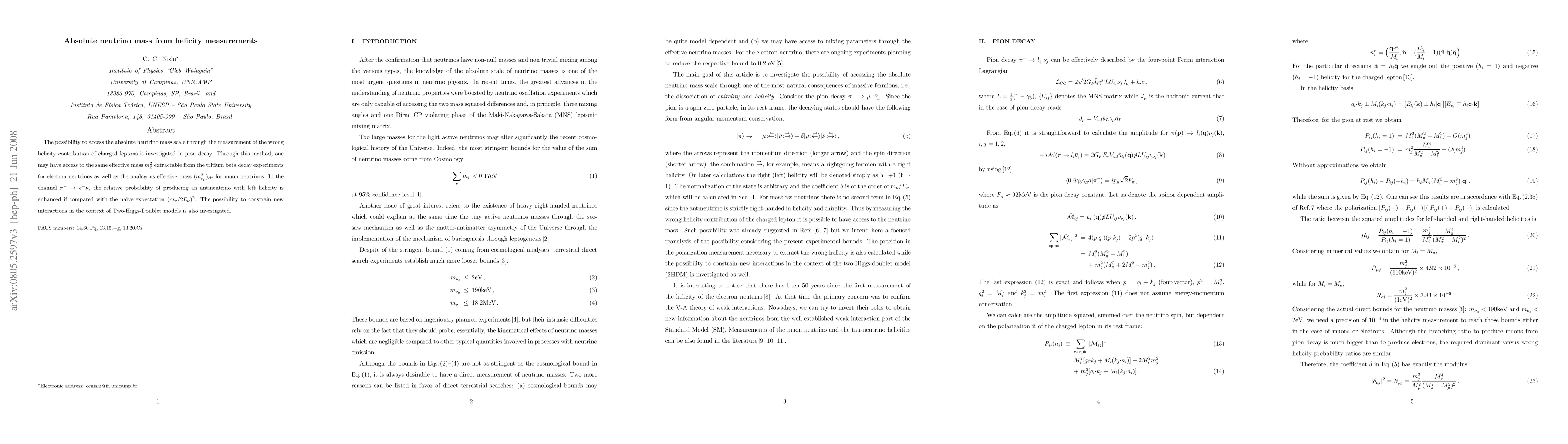 The possibility to access the absolute neutrino mass scale through the measurement of the wrong helicity contribution of charged leptons is investigated in pion decay. Through this method, one may have access to the same effective mass $m^2_\beta$ extractable from the tritium beta decay experiments for electron neutrinos as well as the analogous effective mass $(m^2_{\nu_\mu})_{\rm eff}$ for muon neutrinos. In the channel $\pi^-\to e^-\bar{\nu}$, the relative probability of producing an antineutrino with left helicity is enhanced if compared with the naive expectation $(m_\nu/2E_\nu)^2$. The possibility to constrain new interactions in the context of Two-Higgs-Doublet models is also investigated.
