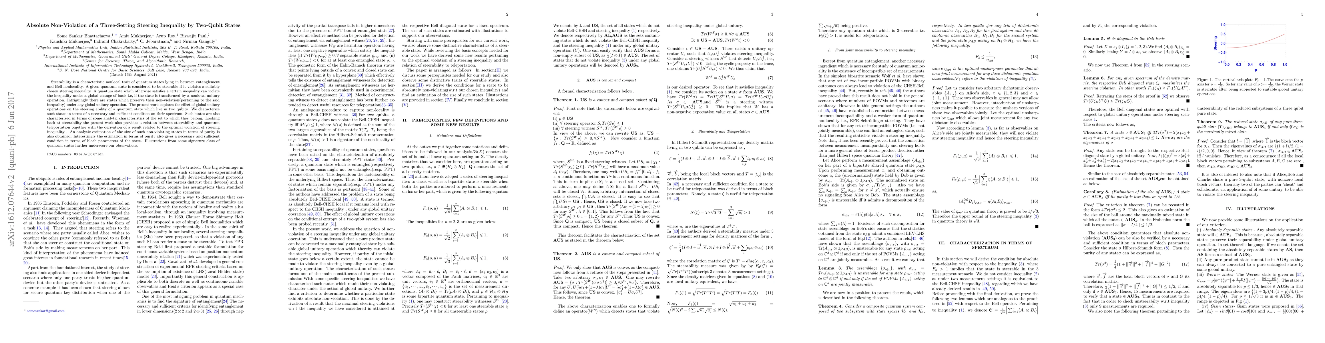 This paper investigates two-qubit quantum states that absolutely do not violate a specific three-setting steering inequality under any global unitary transformation. It characterizes these states through necessary and sufficient conditions on their spectrum and analytic properties, and relates steerability to quantum teleportation.