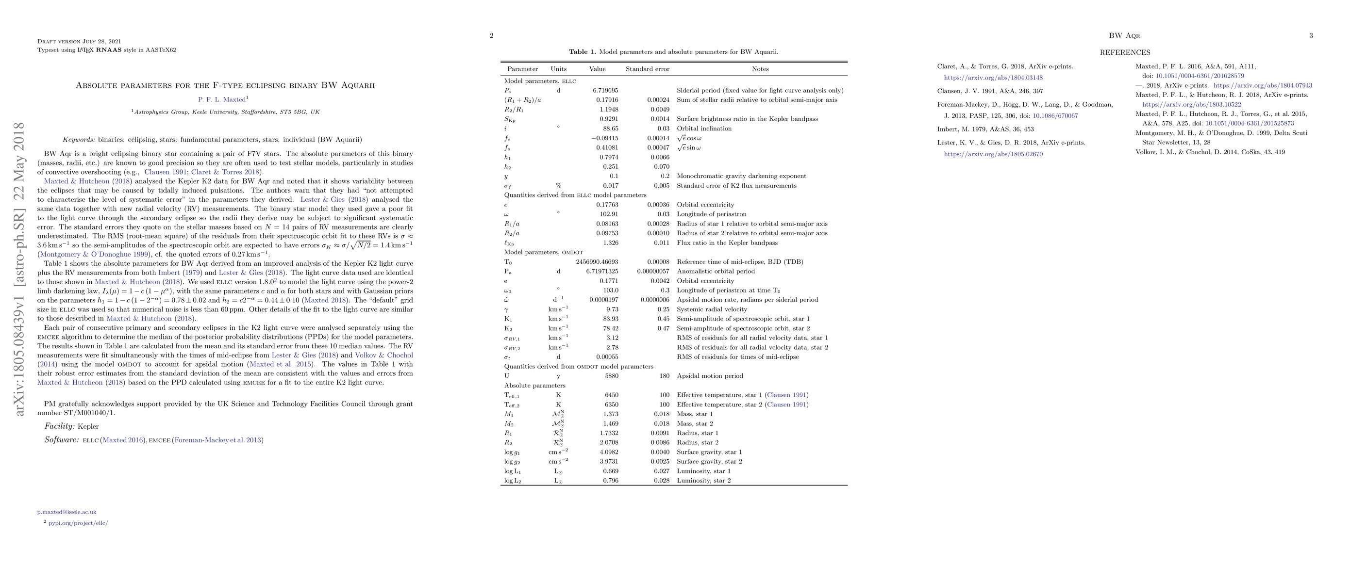 BW Aqr is a bright eclipsing binary star containing a pair of F7V stars. The absolute parameters of this binary (masses, radii, etc.) are known to good precision so they are often used to test stellar models, particularly in studies of convective overshooting. ... Maxted & Hutcheon (2018) analysed the Kepler K2 data for BW Aqr and noted that it shows variability between the eclipses that may be caused by tidally induced pulsations. ... Table 1 shows the absolute parameters for BW Aqr derived from an improved analysis of the Kepler K2 light curve plus the RV measurements from both Imbert (1979) and Lester & Gies (2018). ... The values in Table 1 with their robust error estimates from the standard deviation of the mean are consistent with the values and errors from Maxted & Hutcheon (2018) based on the PPD calculated using emcee for a fit to the entire K2 light curve.