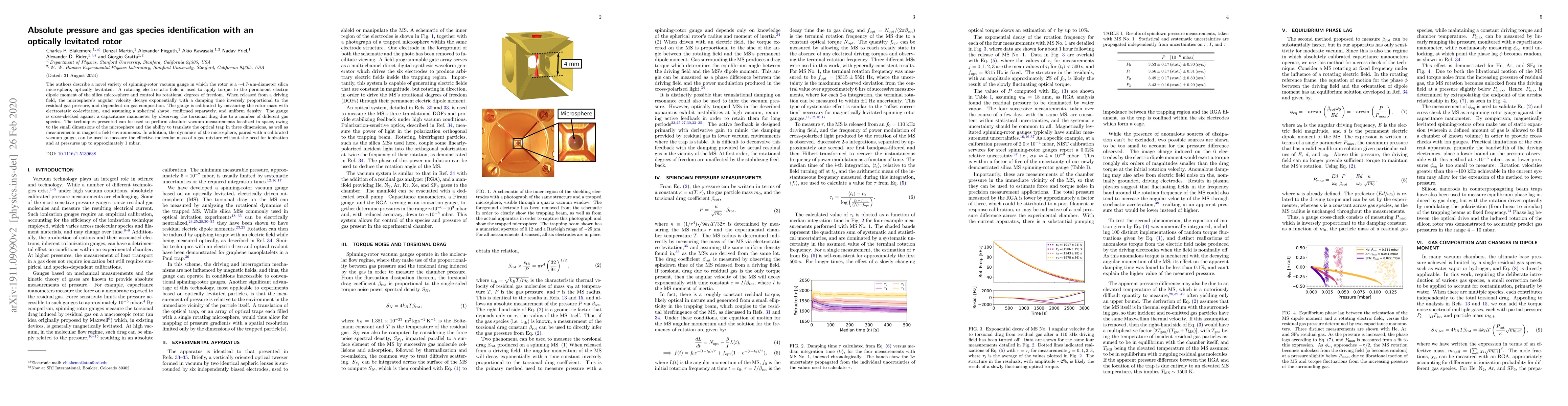 The authors describe a novel variety of spinning-rotor vacuum gauge in which the rotor is a ${\sim}4.7{\text -}\mu$m-diameter silica microsphere, optically levitated. A rotating electrostatic field is used to apply torque to the permanent electric dipole moment of the silica microsphere and control its rotational degrees of freedom. When released from a driving field, the microsphere's angular velocity decays exponentially with a damping time inversely proportional to the residual gas pressure, and dependent on gas composition. The gauge is calibrated by measuring the rotor mass with electrostatic co-levitation, and assuming a spherical shape, confirmed separately, and uniform density. The gauge is cross-checked against a capacitance manometer by observing the torsional drag due to a number of different gas species. The techniques presented can be used to perform absolute vacuum measurements localized in space, owing to the small dimensions of the microsphere and the ability to translate the optical trap in three dimensions, as well as measurements in magnetic field environments. In addition, the dynamics of the microsphere, paired with a calibrated vacuum gauge, can be used to measure the effective molecular mass of a gas mixture without the need for ionization and at pressures up to approximately 1 mbar.