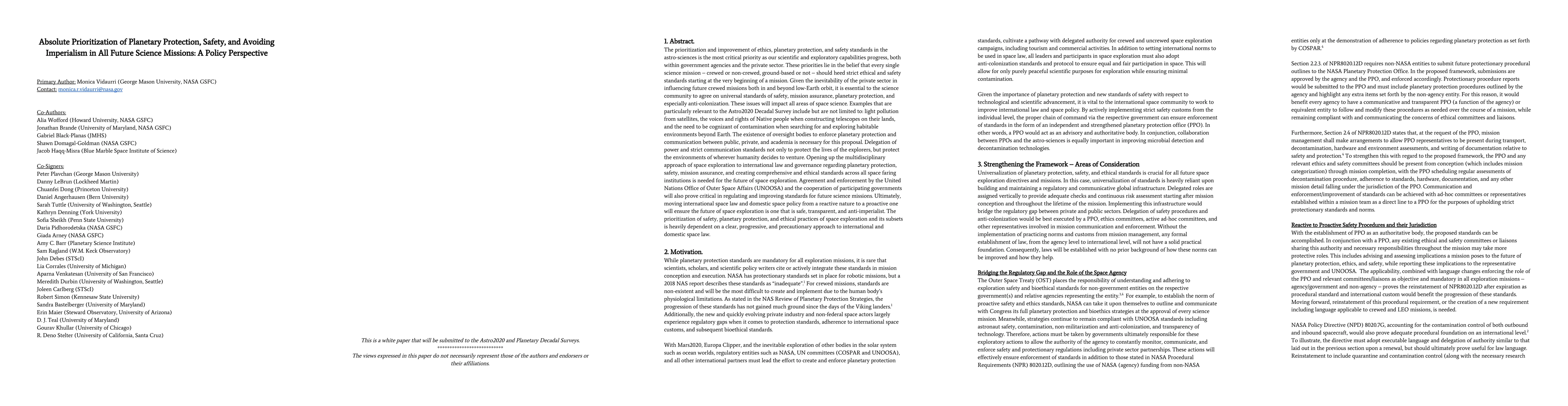 This paper emphasizes the critical need for strict ethical, safety, and planetary protection standards in all future science missions, stressing the importance of proactive international space law and domestic policy to prevent imperialism and contamination, especially in the context of private sector involvement. It calls for universal standards to address issues like light pollution and the rights of indigenous peoples.