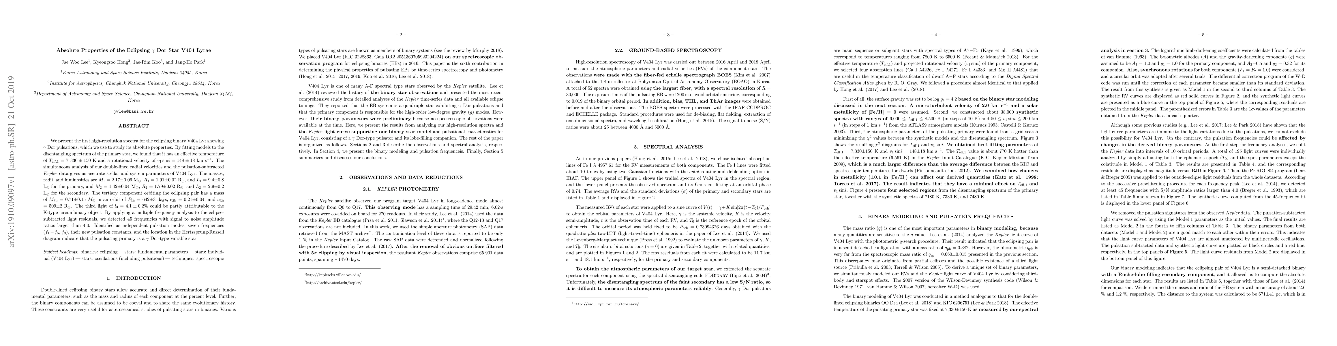 This paper presents high-resolution spectra of the eclipsing binary V404 Lyr, revealing $\gamma$ Dor pulsations, and identifies its absolute properties. The primary star has an effective temperature of 7,330 K and a rotational velocity of 148 km/s, with masses, radii, and luminosities determined for both primary and secondary components.