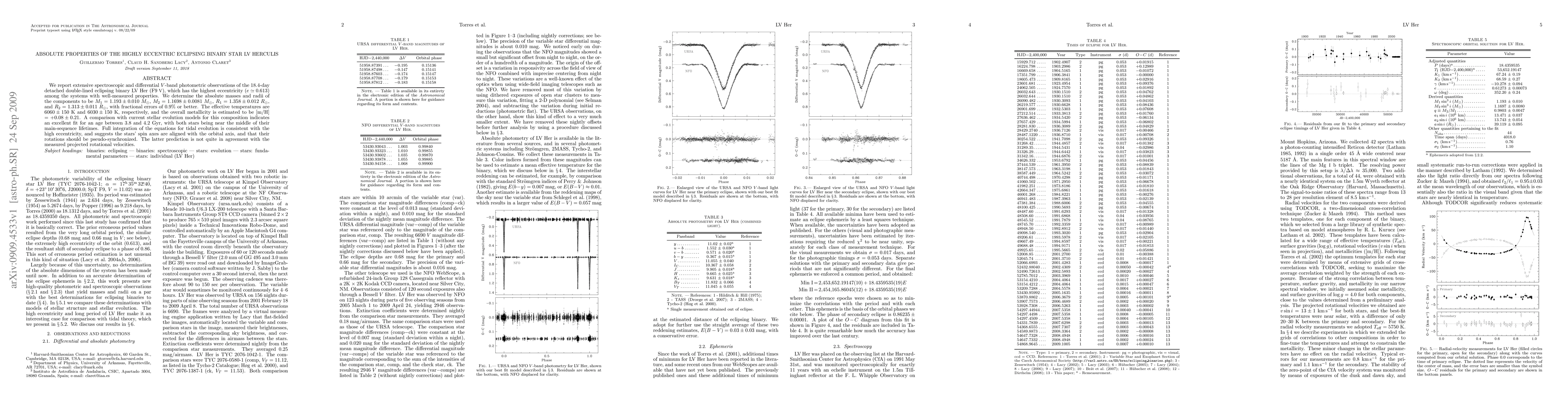 We report extensive spectroscopic and differential V-band photometric observations of the 18.4-day detached double-lined eclipsing binary LV Her (F9V), which has the highest eccentricity (e = 0.613) among the systems with well-measured properties. We determine the absolute masses and radii of the components to be M1 = 1.193 +/- 0.010 M(Sun), M2 = 1.1698 +/- 0.0081 M(Sun), R1 = 1.358 +/- 0.012 R(Sun), and R2 = 1.313 +/- 0.011 R(Sun), with fractional errors of 0.9% or better. The effective temperatures are 6060 +/- 150 K and 6030 +/- 150 K, respectively, and the overall metallicity is estimated to be [m/H] = +0.08 +/- 0.21. A comparison with current stellar evolution models for this composition indicates an excellent fit for an age between 3.8 and 4.2 Gyr, with both stars being near the middle of their main-sequence lifetimes. Full integration of the equations for tidal evolution is consistent with the high eccentricity, and suggests the stars' spin axes are aligned with the orbital axis, and that their rotations should be pseudo-synchronized. The latter prediction is not quite in agreement with the measured projected rotational velocities.