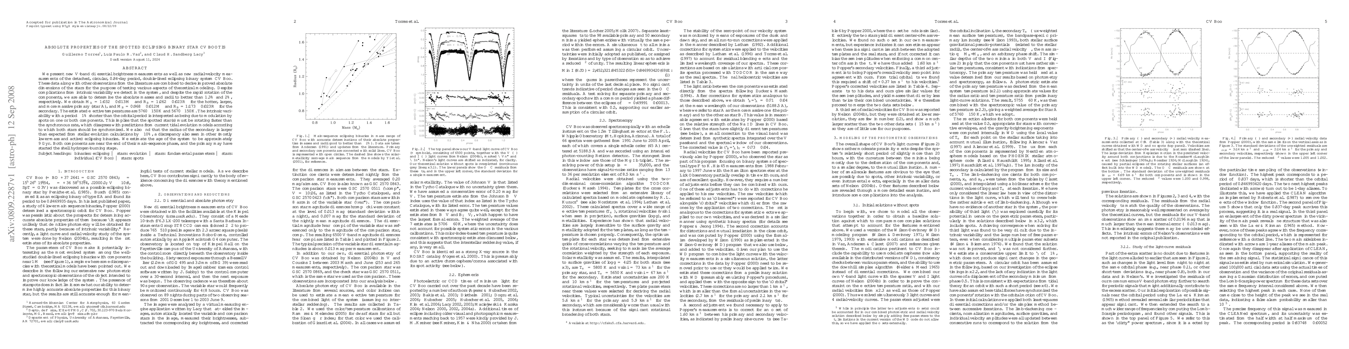 This paper presents new measurements of the binary star system CV Boo, determining improved absolute masses and radii of the stars, finding M(A) = 1.032 +/- 0.013 M(Sun) and R(A) = 1.262 +/- 0.023 R(Sun) for the primary, and M(B) = 0.968 +/- 0.012 M(Sun) and R(B) = 1.173 +/- 0.023 R(Sun) for the secondary. The study also notes intrinsic variability likely due to rotational spots.