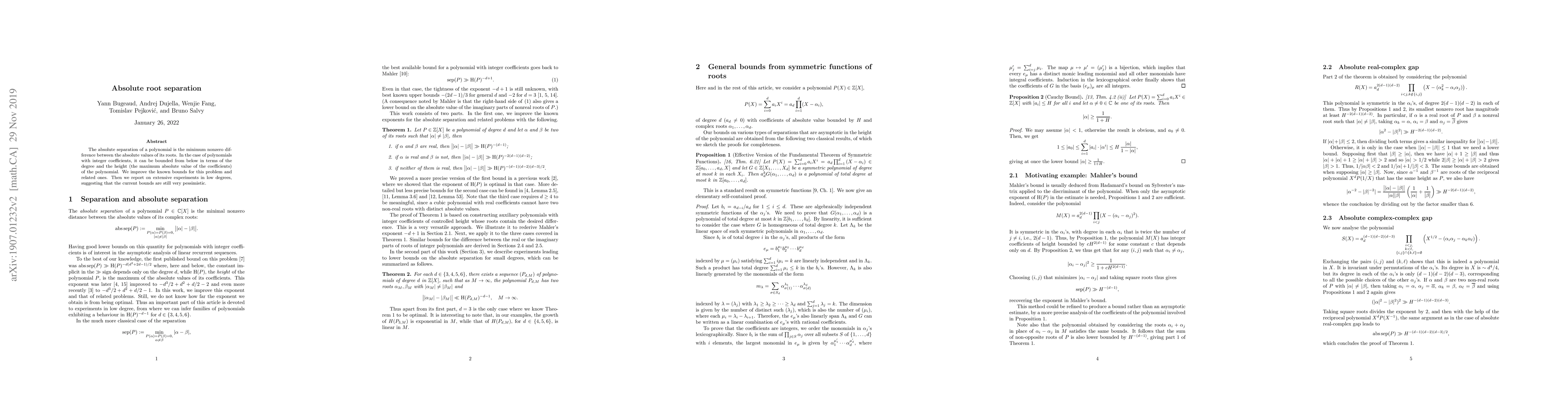 The absolute separation of a polynomial is the minimum nonzero difference between the absolute values of its roots. In the case of polynomials with integer coefficients, it can be bounded from below in terms of the degree and the height (the maximum absolute value of the coefficients) of the polynomial. We improve the known bounds for this problem and related ones. Then we report on extensive experiments in low degrees, suggesting that the current bounds are still very pessimistic.