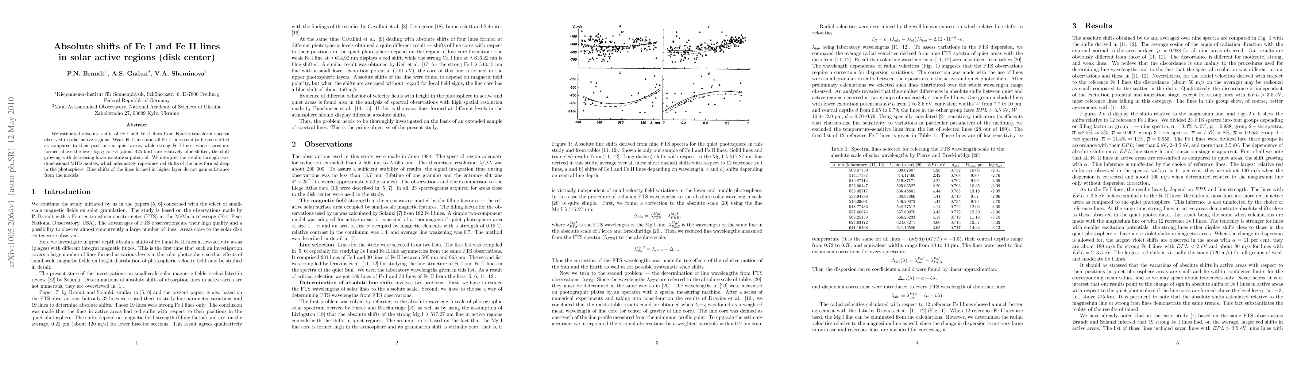 This paper investigates the absolute shifts of Fe I and Fe II lines in solar active regions, finding that weak Fe I lines and all Fe II lines are red-shifted compared to quiet areas, while strong Fe I lines are blue-shifted, with shifts increasing with lower excitation potential. The findings are interpreted using two-dimensional MHD models, which explain the red shifts but not the blue shifts.