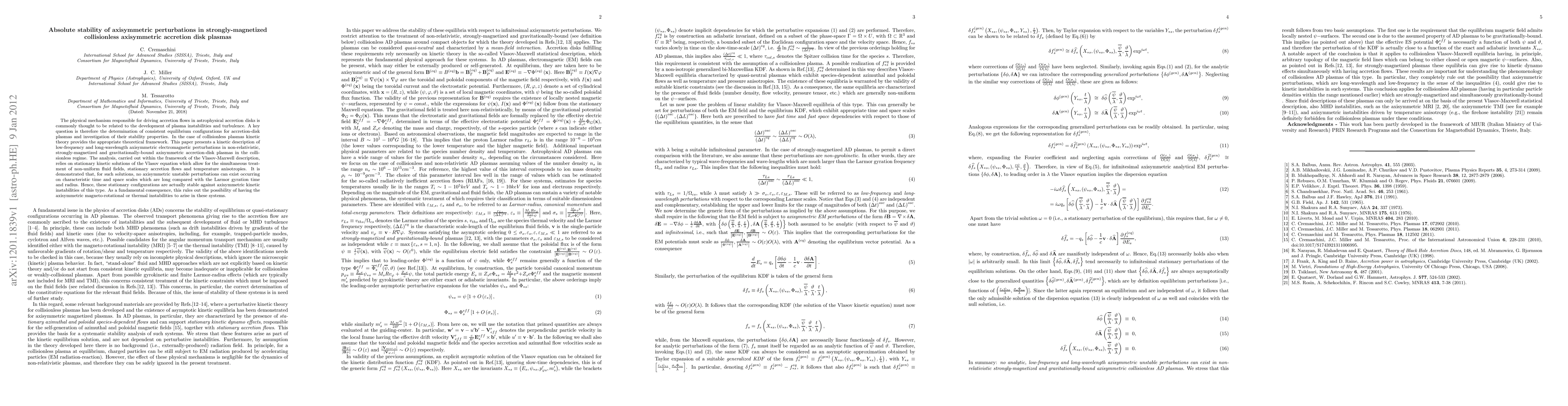 This paper investigates the stability of axisymmetric perturbations in strongly-magnetized, collisionless accretion disk plasmas using kinetic theory. It finds that stationary configurations are stable against axisymmetric kinetic instabilities, ruling out axisymmetric magneto-rotational or thermal instabilities in such systems.