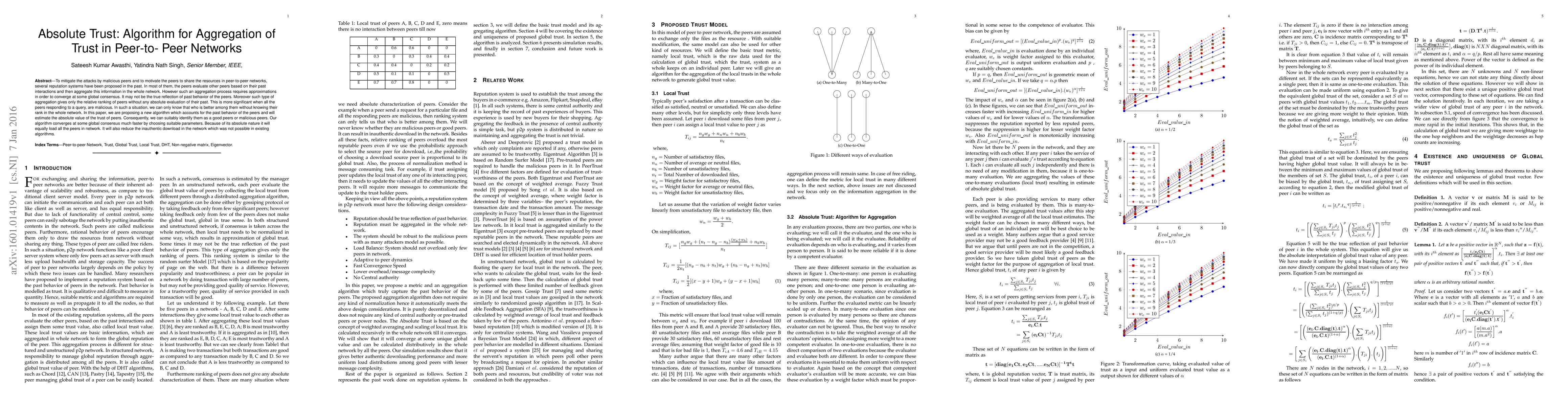 This paper proposes a new algorithm to aggregate trust in peer-to-peer networks, aiming to provide an absolute evaluation of peers' past behavior rather than just relative rankings. The algorithm converges faster and more accurately, reducing inauthentic downloads and ensuring equal network load.