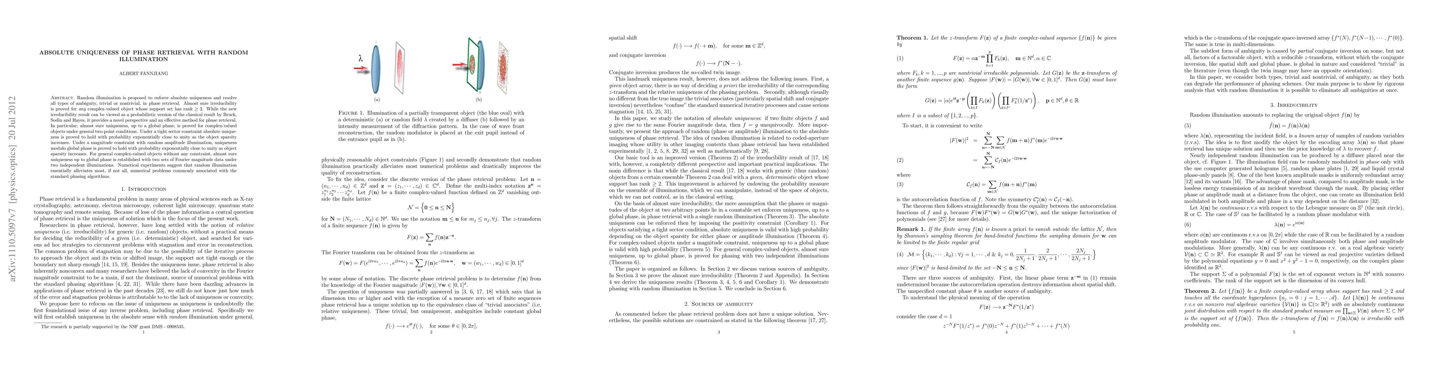 The research proposes random illumination to enforce absolute uniqueness in phase retrieval, proving almost sure irreducibility for complex-valued objects of full rank support. It extends classical results by Bruck, Sodin, and Hayes, providing a novel perspective and effective method for phase retrieval.