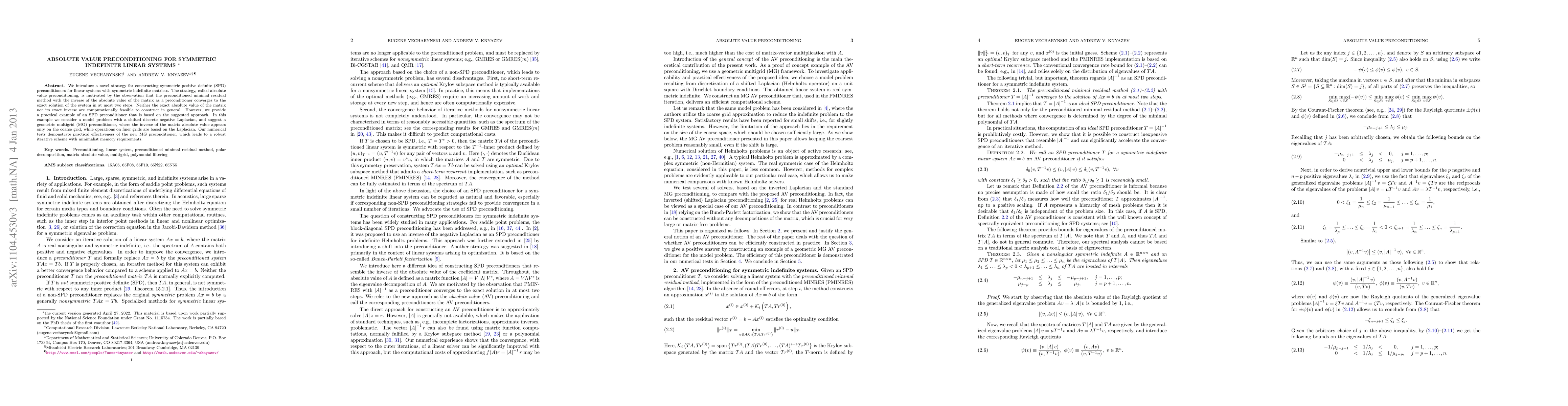 This paper proposes a new preconditioning method called absolute value preconditioning for solving symmetric indefinite linear systems. The method is shown to be effective through a practical example using a geometric multigrid approach, demonstrating robust convergence and minimal memory requirements.