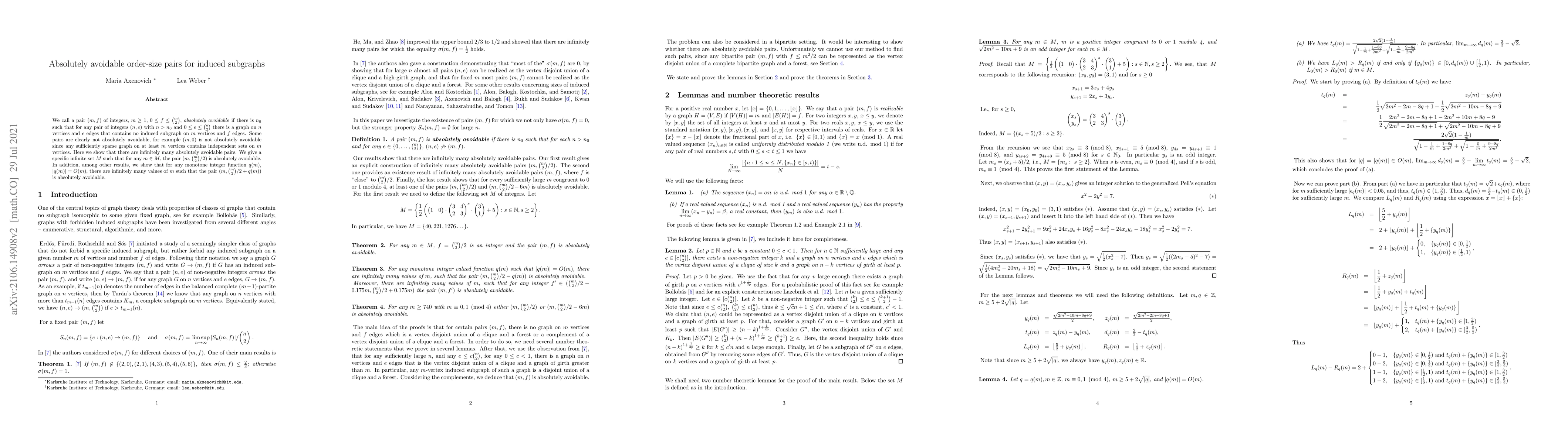 This paper investigates "absolutely avoidable" order-size pairs for induced subgraphs, demonstrating the existence of infinitely many such pairs. Specifically, it shows that for certain infinite sets, pairs of the form $(m, \binom{m}{2}/2)$ are absolutely avoidable, as well as pairs $(m, \binom{m}{2}/2 +q(m))$ for monotone functions $q(m)$ with $|q(m)|=O(m)$.