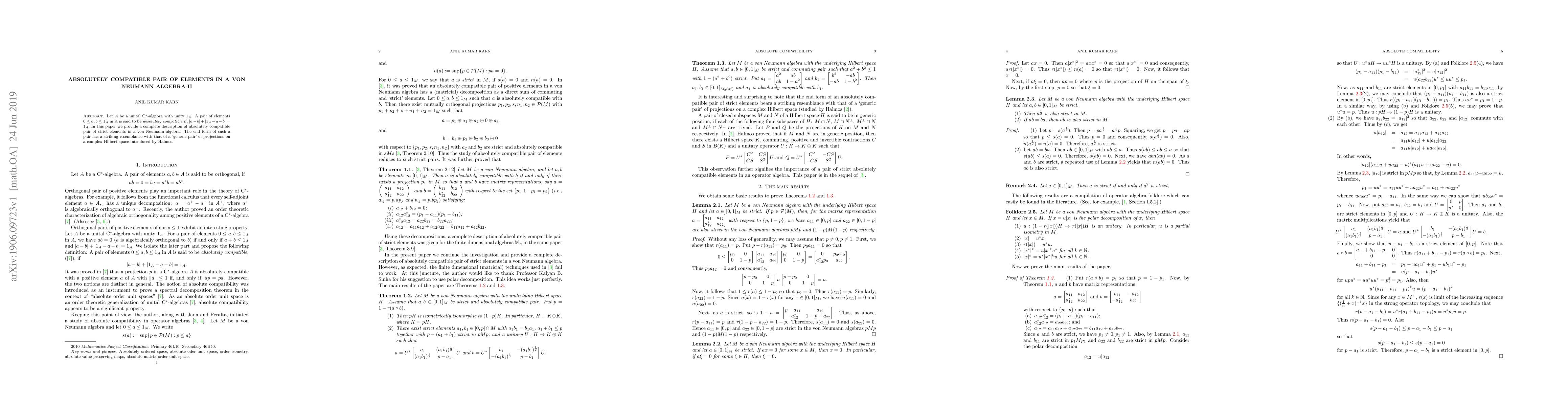 Let $A$ be a unital C$^*$-algebra with unity $1_A$. A pair of elements $0 \le a, b \le 1_A$ in $A$ is said to be \emph{absolutely compatible} if, $\vert a - b \vert + \vert 1_A - a - b \vert = 1_A.$ In this paper we provide a complete description of absolutely compatible pair of strict elements in a von Neumann algebra. The end form of such a pair has a striking resemblance with that of a `generic pair' of projections on a complex Hilbert space introduced by Halmos.