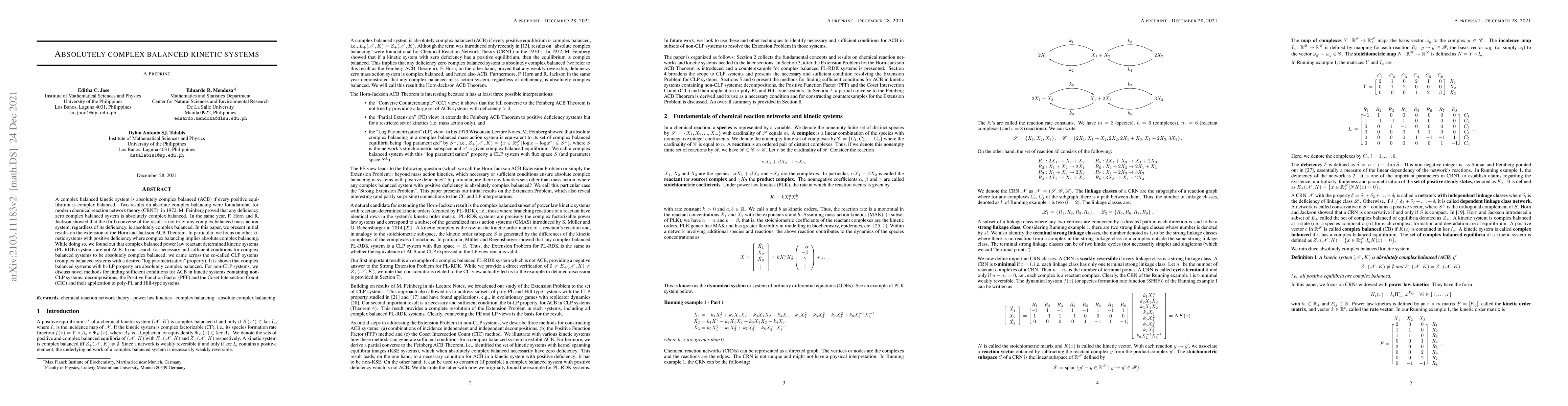 This paper explores the extension of the Horn and Jackson theorem on absolute complex balancing (ACB) in kinetic systems, identifying conditions under which complex balancing implies ACB. It reveals that PL-RDK systems are not ACB and introduces CLP systems, showing that those with bi-LP property are ACB, while proposing novel methods like decompositions, PFF, and CIC for non-CLP systems.