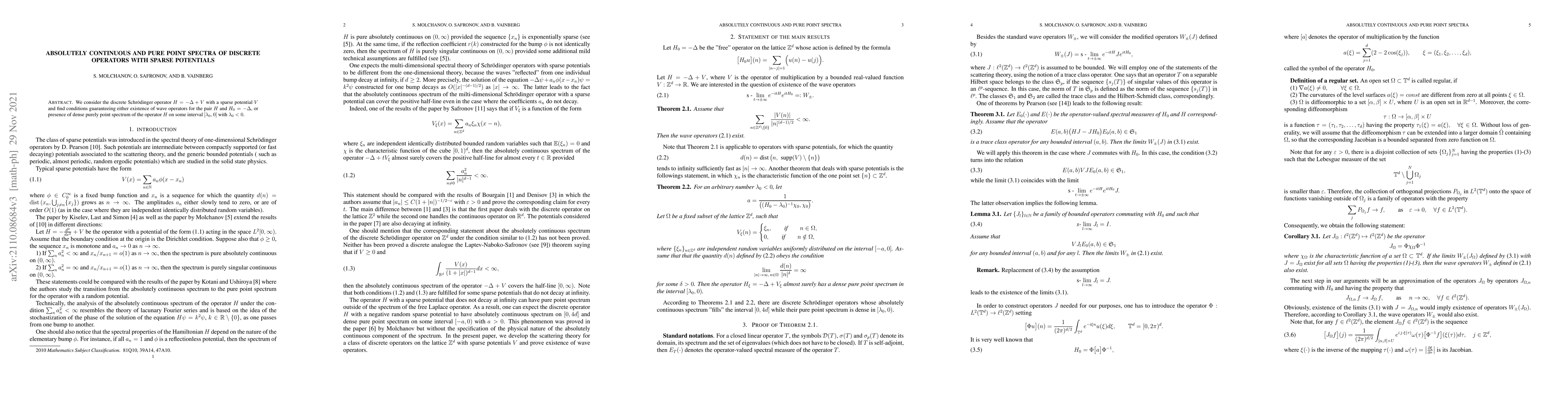 We consider the discrete Schr\"odinger operator $H=-\Delta+V$ with a sparse potential $V$ and find conditions guaranteeing either existence of wave operators for the pair $H$ and $H_0=-\Delta$, or presence of dense purely point spectrum of the operator $H$ on some interval $[\lambda_0,0]$ with $\lambda_0<0$.