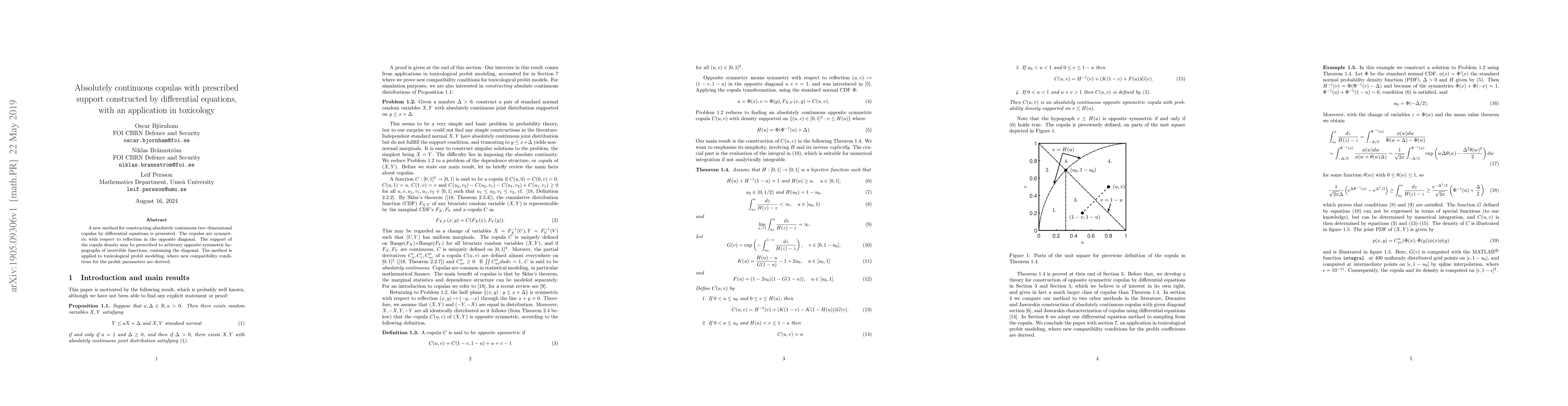 A new method for constructing absolutely continuous two--dimensional copulas by differential equations is presented. The copulas are symmetric with respect to reflection in the opposite diagonal. The support of the copula density may be prescribed to arbitrary opposite symmetric hypographs of invertible functions, containing the diagonal. The method is applied to toxicological probit modeling, where new compatibility conditions for the probit parameters are derived.