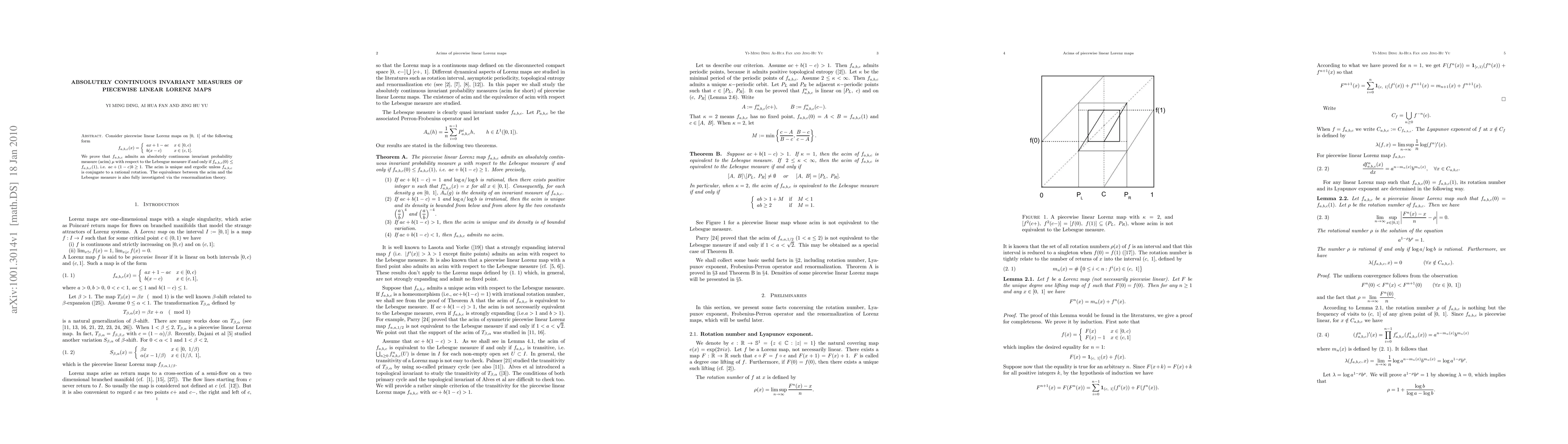 Consider piecewise linear Lorenz maps on $[0, 1]$ of the following form \[ f_{a,b,c}(x)= {ll} ax+1-ac & x \in [0, c) b(x-c) & x \in (c, 1].\] We prove that $f_{a,b,c}$ admits an absolutely continuous invariant probability measure (acim) $\mu$ with respect to the Lebesgue measure if and only if $f_{a,b,c}(0) \le f_{a,b,c}(1)$, i.e. $ac+(1-c)b \ge 1$. The acim is unique and ergodic unless $f_{a,b,c}$ is conjugate to a rational rotation. The equivalence between the acim and the Lebesgue measure is also fully investigated via the renormalization theory.