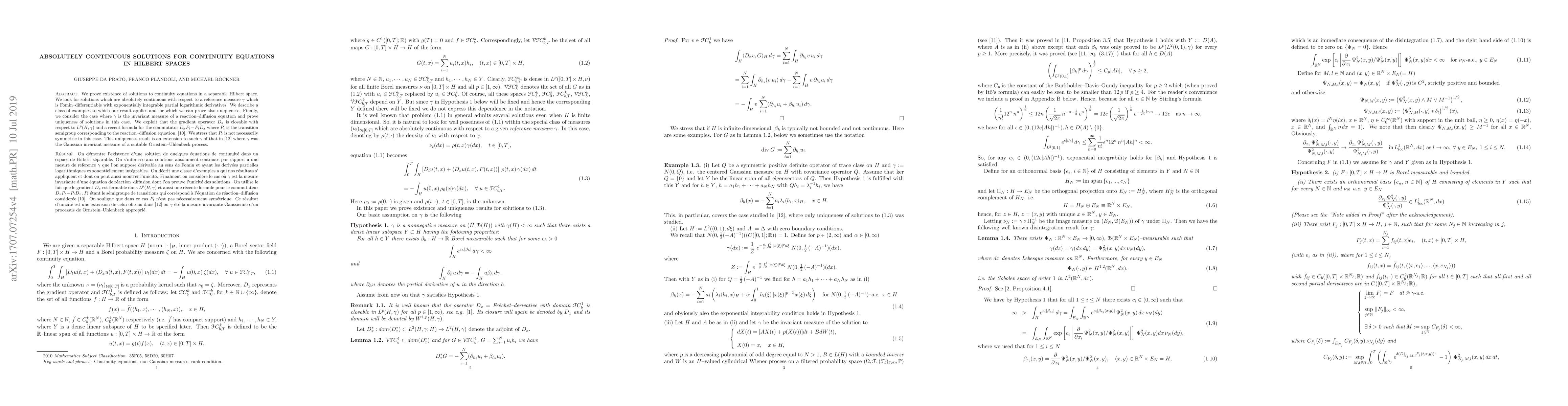 We prove existence of solutions to continuity equations in a separable Hilbert space. We look for solutions which are absolutely continuous with respect to a reference measure \gamma which is Fomin-differentiable with exponentially integrable partial logarithmic derivatives. We describe a class of examples to which our result applies and for which we can prove also uniqueness. Finally, we consider the case where \gamma is the invariant measure of a reaction-diffusion equation and prove uniqueness of solutions in this case. We exploit that the gradient operator D_x is closable with respect to L^p(H,\gamma) and a recent formula for the commutator D_xP_t - P_tD_x where P_t is the transition semigroup corresponding to the reaction-diffusion equation, [DaDe14]. We stress that P_t is not necessarily symmetric in this case. This uniqueness result is an extension to such \gamma of that in [DaFlRo14] where \gamma was the Gaussian invariant measure of a suitable Ornstein-Uhlenbeck process.