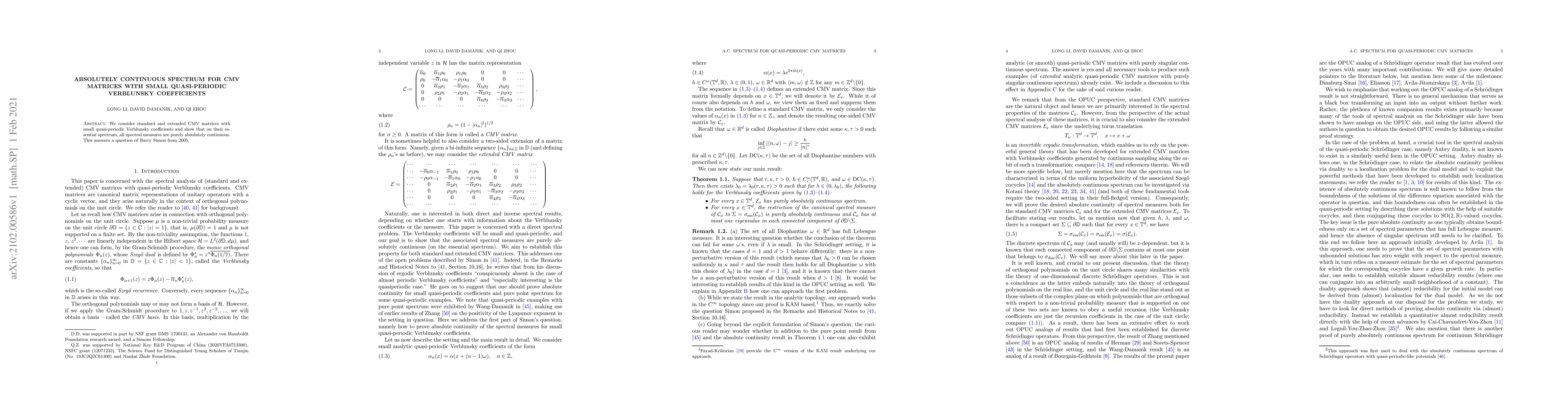 Summary: This paper demonstrates that CMV matrices with small quasi-periodic Verblunsky coefficients exhibit purely absolutely continuous spectral measures on their essential spectrum, resolving a question posed by Barry Simon in 2005.