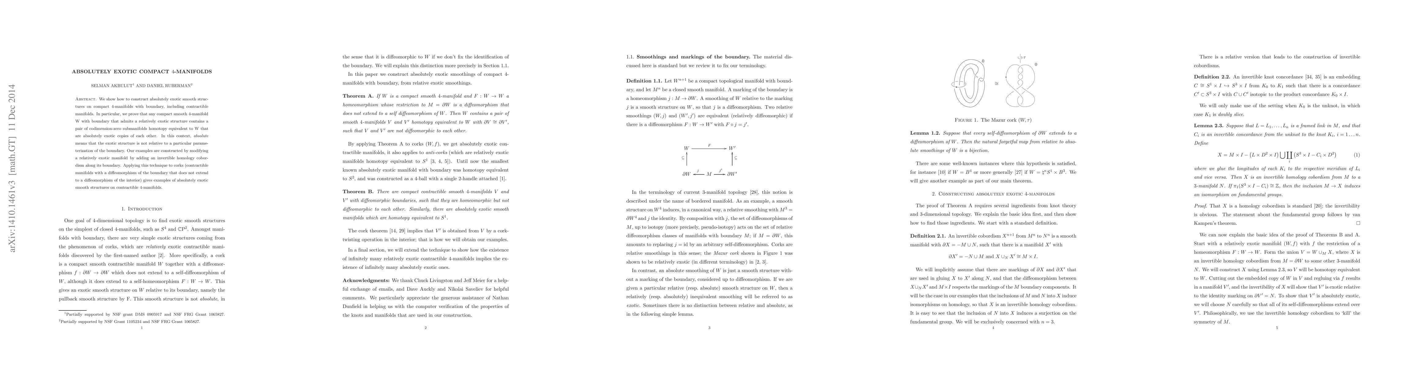 The paper demonstrates the construction of absolutely exotic smooth structures on compact 4-manifolds with boundary, including contractible examples, by modifying relatively exotic manifolds with an invertible homology cobordism along their boundary. These examples show that any compact smooth 4-manifold with a relatively exotic structure contains codimension-zero submanifolds that are absolutely exotic copies of each other.