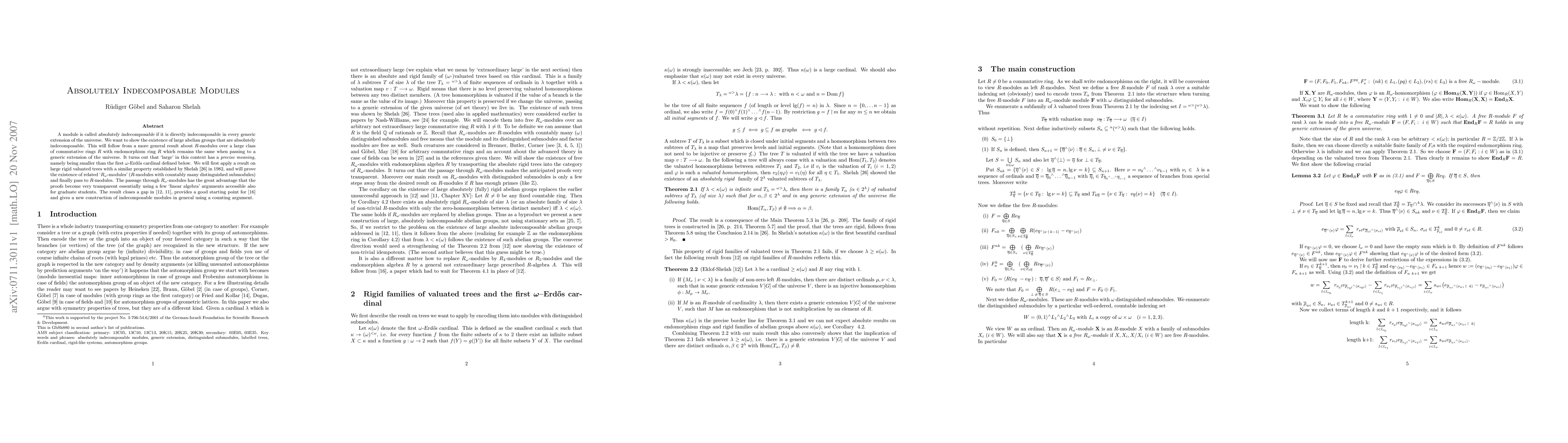A module is called absolutely indecomposable if it is directly indecomposable in every generic extension of the universe. We want to show the existence of large abelian groups that are absolutely indecomposable. This will follow from a more general result about R-modules over a large class of commutative rings R with endomorphism ring R which remains the same when passing to a generic extension of the universe. It turns out that `large' in this context has the precise meaning, namely being smaller then the first omega-Erdos cardinal defined below. We will first apply result on large rigid trees with a similar property established by Shelah in 1982, and will prove the existence of related ` R_omega-modules' (R-modules with countably many distinguished submodules) and finally pass to R-modules. The passage through R_omega-modules has the great advantage that the proofs become very transparent essentially using a few `linear algebra' arguments accessible also for graduate students. The result gives a new construction of indecomposable modules in general using a counting argument.