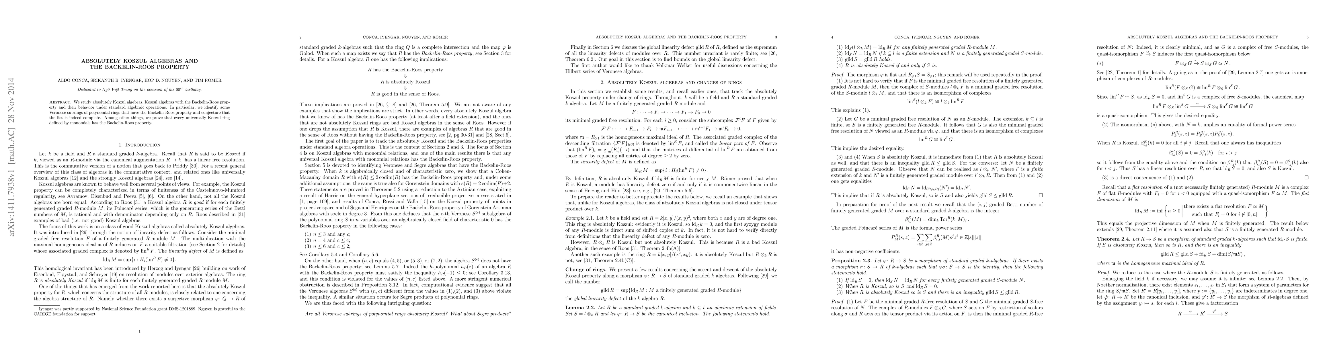 This paper investigates absolutely Koszul algebras and those with the Backelin-Roos property, focusing on their behavior under algebraic operations. It also identifies specific Veronese subrings of polynomial rings with the Backelin-Roos property and conjectures the completeness of this list.