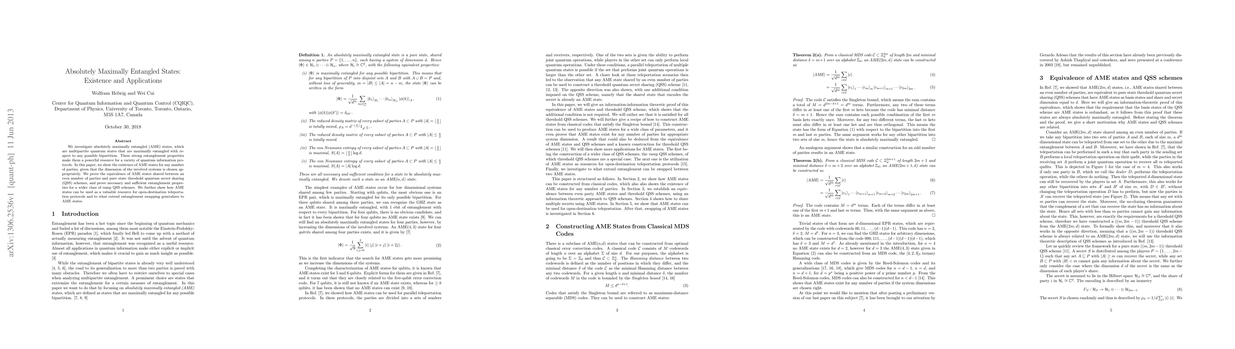 This paper explores the existence and applications of absolutely maximally entangled (AME) states, demonstrating their existence for any number of parties under appropriate dimensional conditions. It establishes the equivalence of AME states with pure state threshold quantum secret sharing schemes and discusses their role in open-destination teleportation and entanglement swapping.